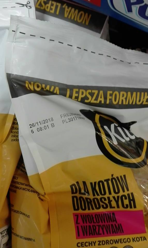 Karmę wyrzuciłem kupiłem inną.. Dziś wybrałem się na zakupy przechodząc obok działu z karmami postanowiłem spojrzeć na daty: stały DWA DUŻE Kartony tej karmy każda z datą : 26/11/2018. Po zapytaniu Pani która dział obok wykładała towar dlaczego wykładają towar po terminie stwierdziła "że ona tego nie wykładała i ona nic nie wie.. po czym sobie poszła" - napisał do nasz Czytelnik