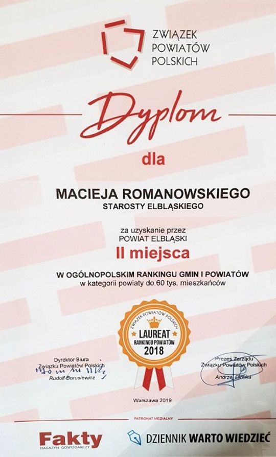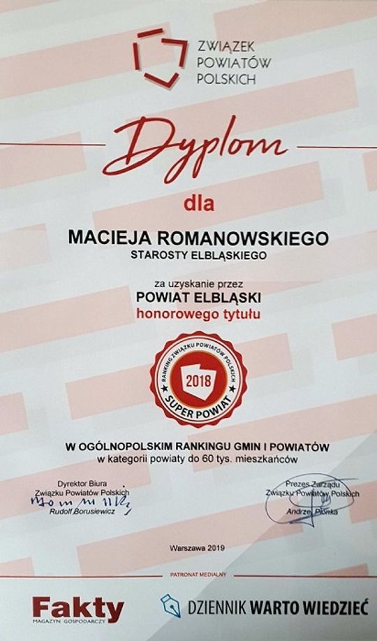 Podczas uroczystej Gali Jubileuszowej starosta Maciej Romanowski odebrał dyplomy i okolicznościowe statuetki za osiągnięcia Powiatu Elbląskiego za 2018 rok: tytuł „Super Powiat 2018” oraz 2. miejsce w rankingu powiatów do 60 tysięcy mieszkańców, awansując z miejsca 10. osiągniętego rok wcześniej.