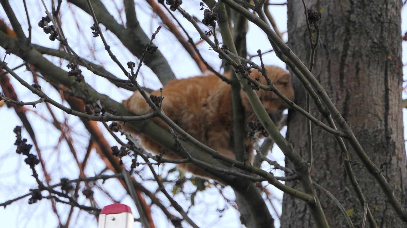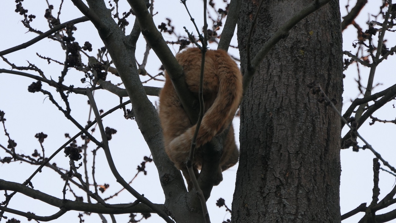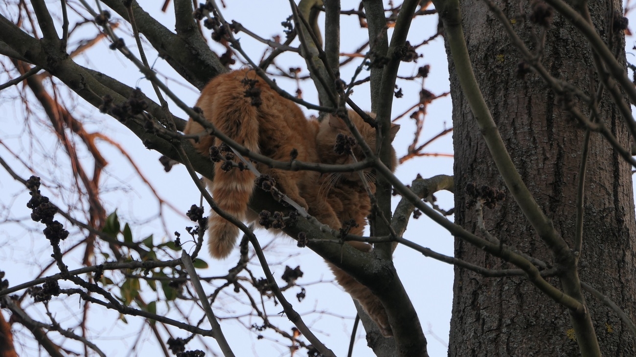 Strażacy na miejscu interwencji rozstawili drabiny, w momencie kiedy jeden ze strażaków wchodził po drabinie na szczyt drzewa, kot zdecydował się sam z niego zejść.