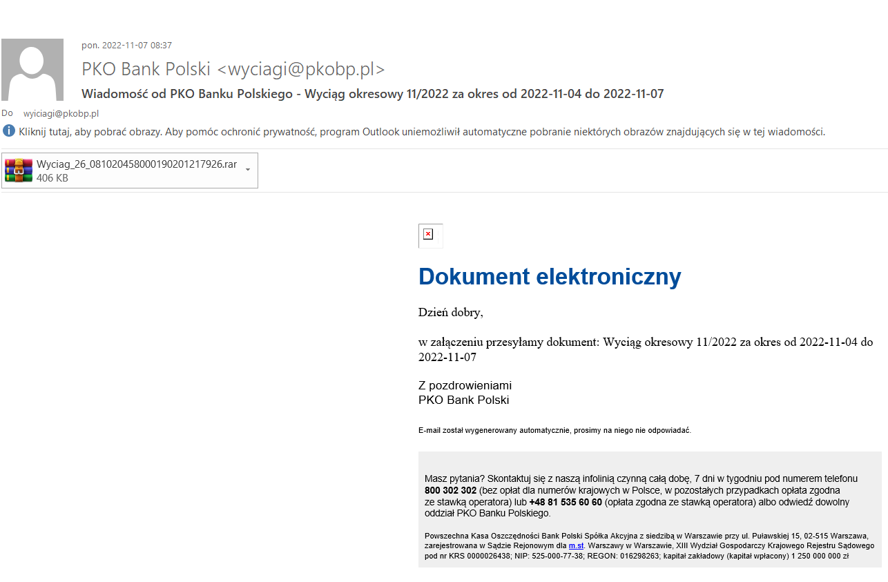 Załącznik zawiera złośliwe oprogramowanie - "Nie otwieraj go, nie klikaj też w linki w tego rodzaju e-mailach. Możesz stracić pieniądze i kontrolę nad kontem" - ostrzega PKO Bank Polski.