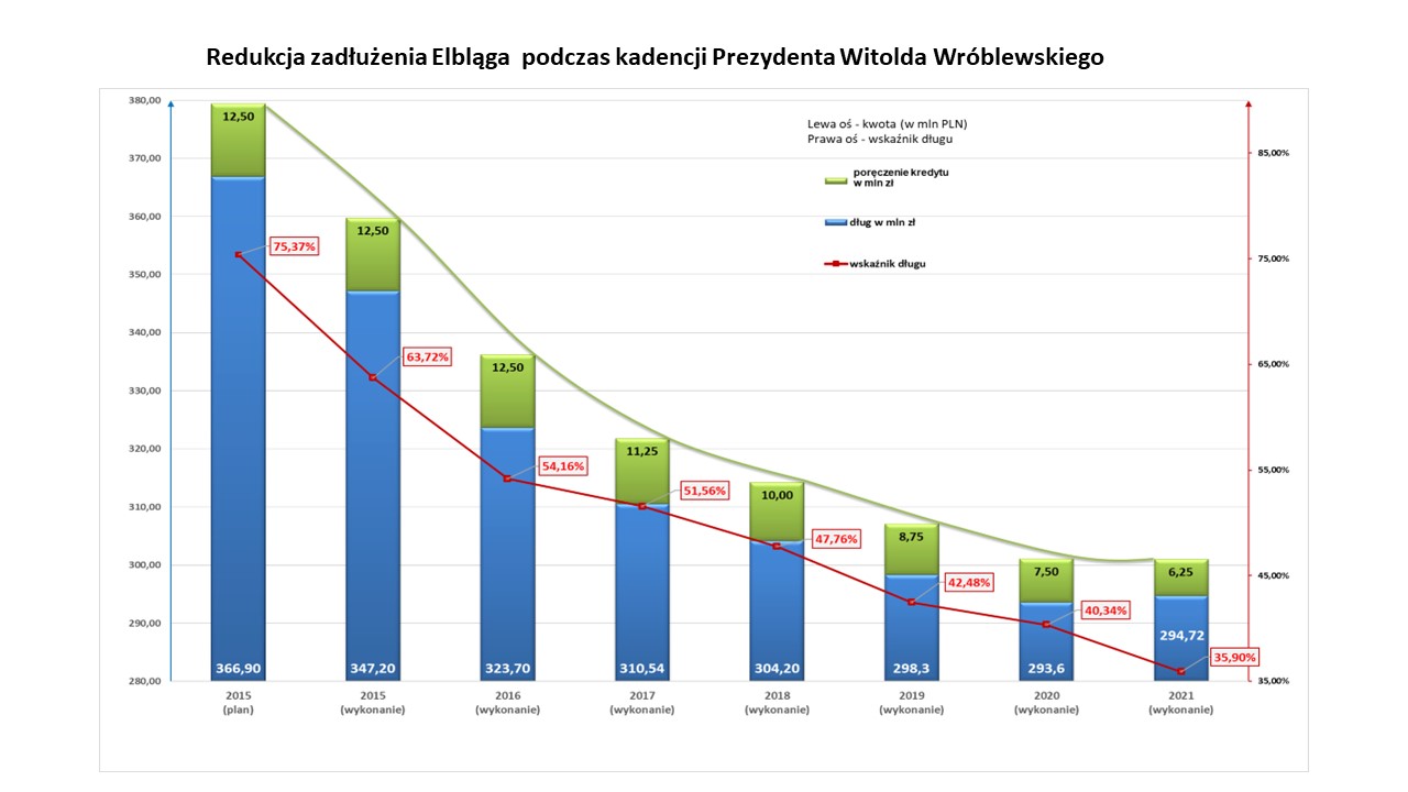 W 2014 roku Elbląg był jednym z najbardziej zadłużonych miast w Polsce. W planie budżetu na rok 2015 przygotowanym przez poprzednie władze, dług miasta wraz ze zobowiązaniami wynosił 379,4 mln. Wdrożony przez nas i konsekwentnie realizowany przez ostatnie lata plan oddłużania miasta spowodował spadek zadłużenia do ok. 290 mln zł. To znaczy, że zredukowaliśmy zadłużenie o blisko 90 mln zł, co prezentuje poniższy wykres.