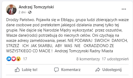 "Drodzy Państwo. Pojawiła się w Elblągu, grupa ludzi zbierających wasze dane osobowe pod pretekstem jakiegoś działania znanej tylko tej grupie. Nie dajcie się Narodzie Mądry wykorzystać przez oszustów, Wasze dane (rodo) potrzebują do niecnych celów. Oni czyhają na wasze adresy zameldowania, pesel" - napisał na portalu społecznościowym Facebook Andrzej Tomczyński, radny Elbląga.