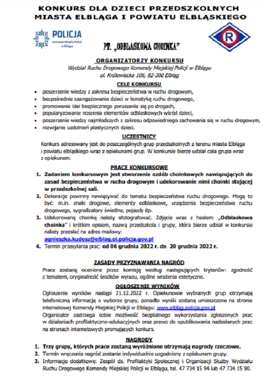 Serdecznie zapraszamy dzieci w wieku przedszkolnym do udziału w konkursie organizowanym przez Wydział Ruchu Drogowego Komendy Miejskiej Policji w Elblągu, pn. „Odblaskowa Choinka”. Konkurs adresowany jest do grup przedszkolnych z terenu Elbląga i powiatu elbląskiego wraz z opiekunami. Zadanie konkursowe polega na stworzeniu ozdób choinkowych nawiązujących do zasad bezpieczeństwa w ruchu drogowym. Kolejnym etapem jest udekorowanie nimi choinki stojącej w przedszkolnej sali. Spośród zgłoszonych prac komisja konkursowa wybierze trzy „choinki”. Grupy, których prace zostaną wyróżnione otrzymają dyplomy i nagrody rzeczowe. Szczegóły przebiegu konkursu zawiera regulamin.