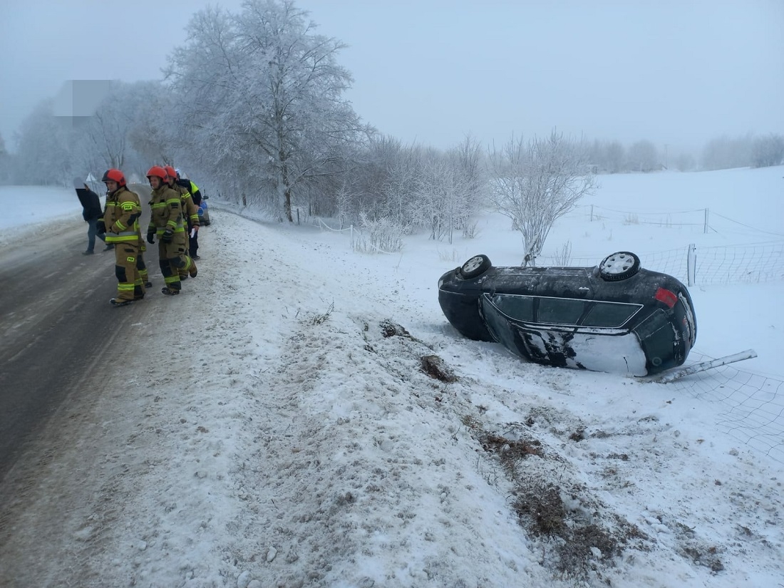 61-letnia kobieta kierująca audi, nie dostosowała prędkości do panujących na drodze trudnych warunków, w wyniku czego wypadła z drogi, a auto wywróciło się na dach.