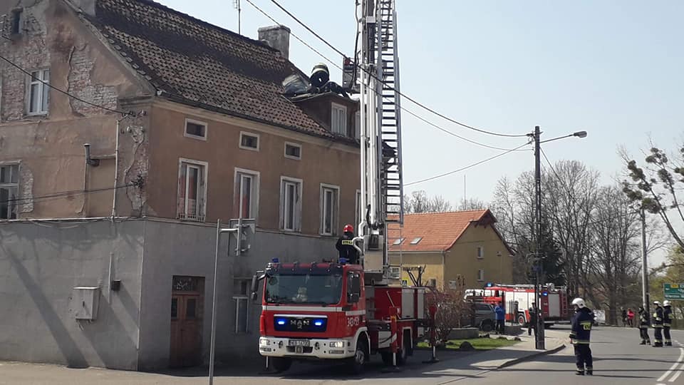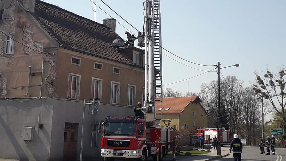 "W dniu 23 kwietnia doszło do zerwania poszycia dachowego na budynku piekarni w Młynarach. W akcji brały udział dwa zastępy z OSP w Młynarach oraz podnośnik z JRG Pasłęk."