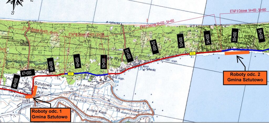 Na odcinku od ronda w Stegnie – skrzyżowanie z ulicą Morską – do zjazdu na teren Przedsiębiorstwa Komunalnego „Mierzeja” Sp. z o.o.