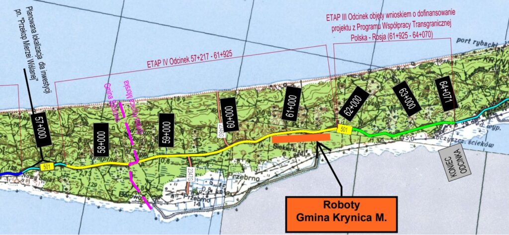 Na odcinku od km 60+720 do km 61+500 (wahadło – na wjeździe do Krynicy Morskiej)