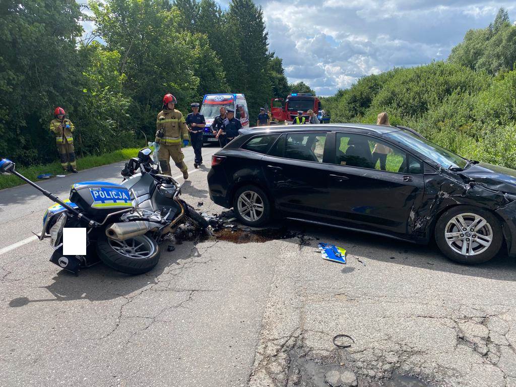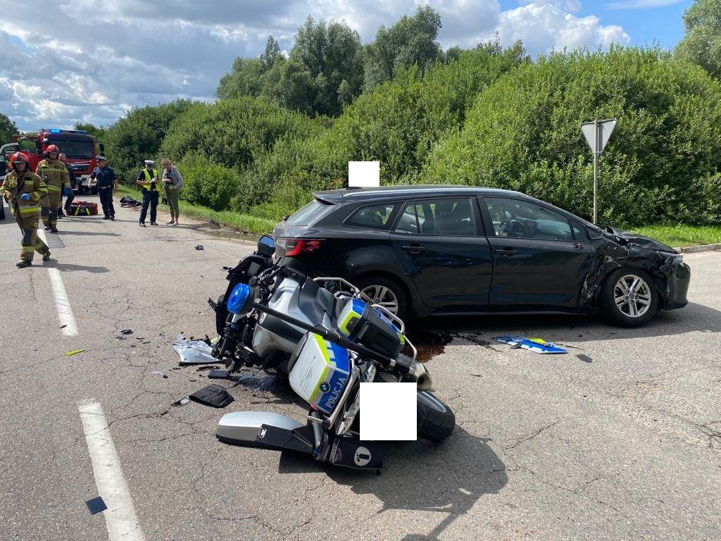 Według wstępnych ustaleń policji kobieta kierująca osobową Toyotą skręcając w kierunku oczyszczalni ścieków wymusiła pierwszeństwo. W wyniku zdarzenia ucierpiał policjant kierujący motocyklem, który trafił pod opiekę zespołu ratownictwa medycznego.