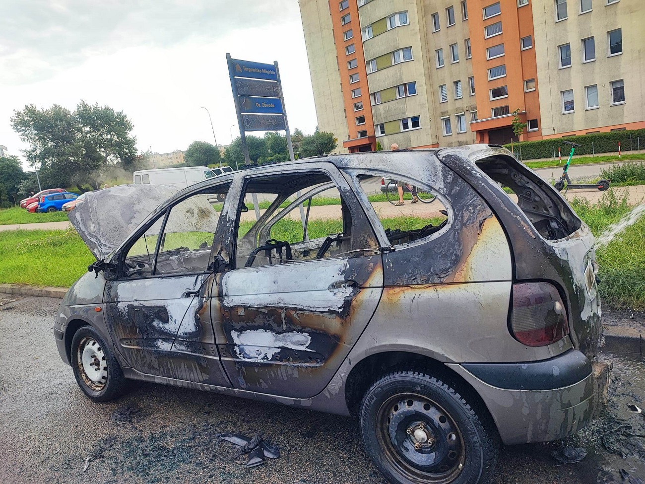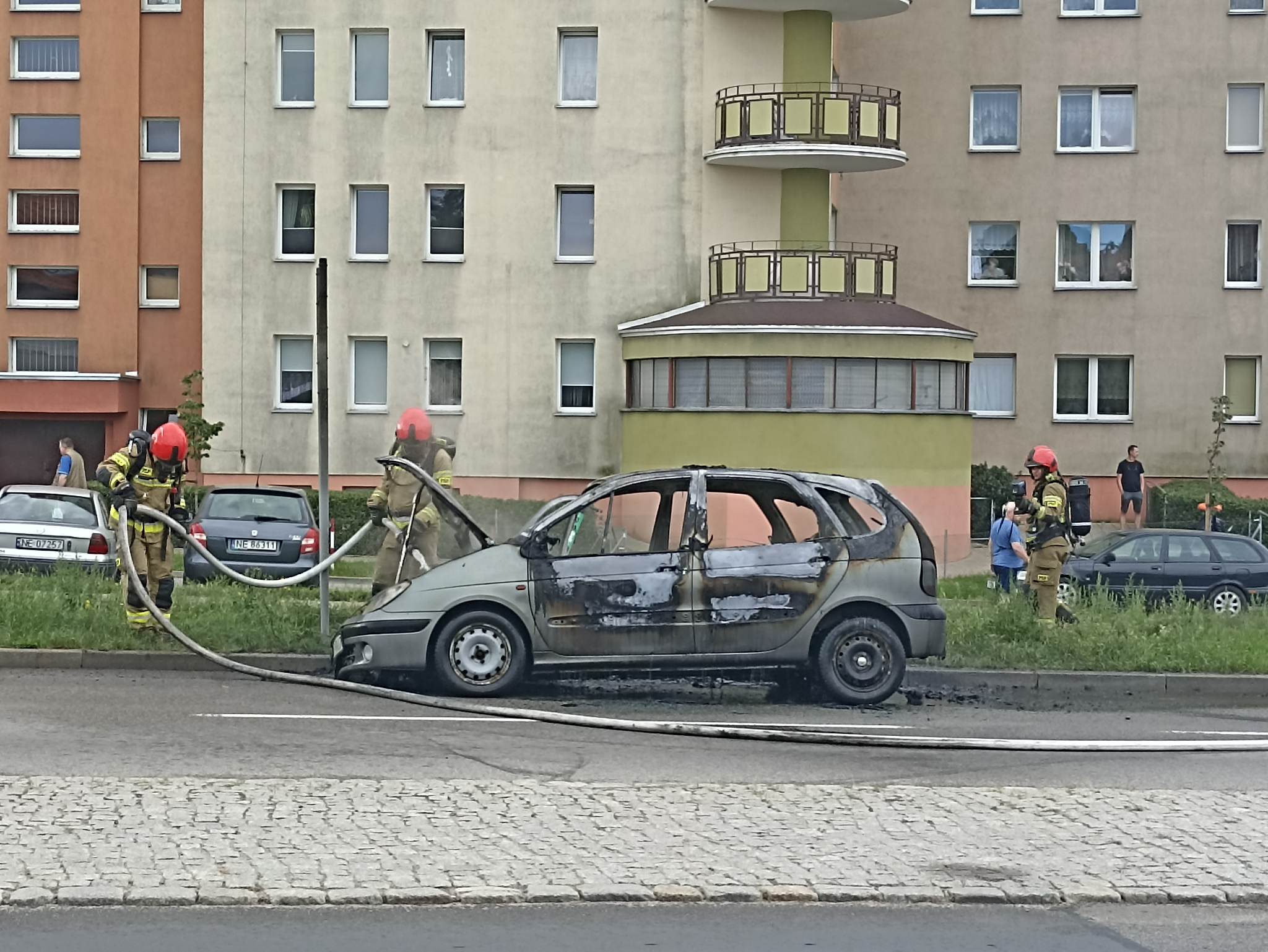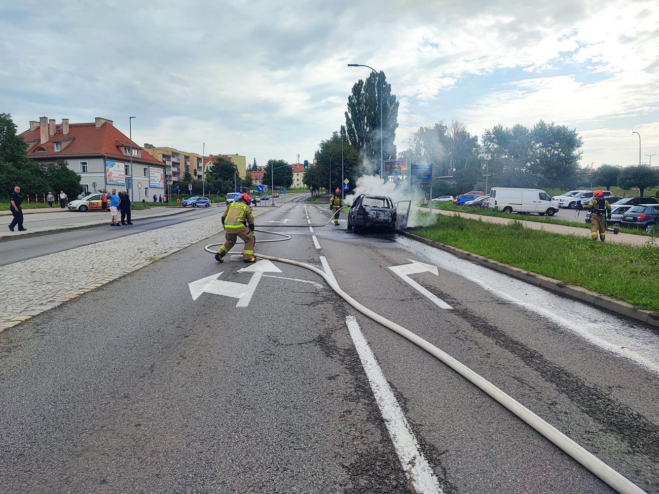 Na miejsce została zadysponowana policja oraz straż pożarna. Auto spłonęło doszczętnie, na szczęście nit nie ucierpiał.