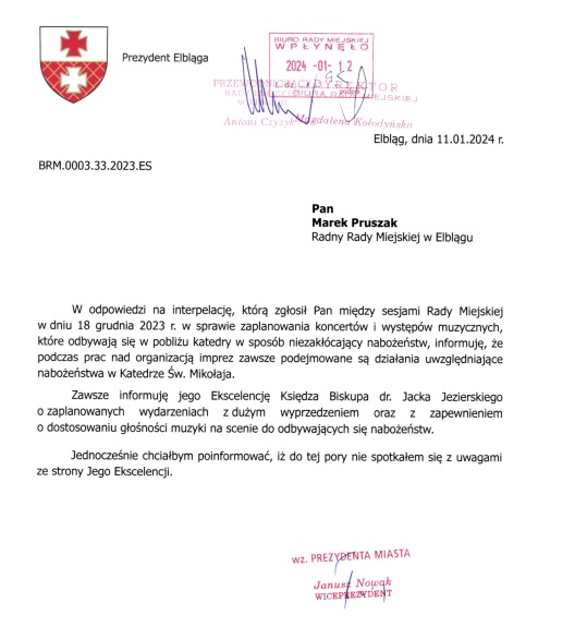 "Informuję, że podczas prac nad organizacją imprez zawsze podejmowane są działania uwzględniające nabożeństwa w Katedrze Św. Mikołaja. Zawsze informuję jego Ekscelencję Księdza Biskupa dr. Jacka Jezierskiego o zaplanowanych wydarzeniach z dużym wyprzedzeniem oraz z zapewnieniem o dostosowaniu głośności muzyki na scenie do odbywających się nabożeństw. Jednocześnie chciałbym poinformować, iż do tej pory nie spotkałem się z uwagami ze strony Jego Ekscelencji" - odpisał Janusz Nowak, wiceprezydent Elbląga.
