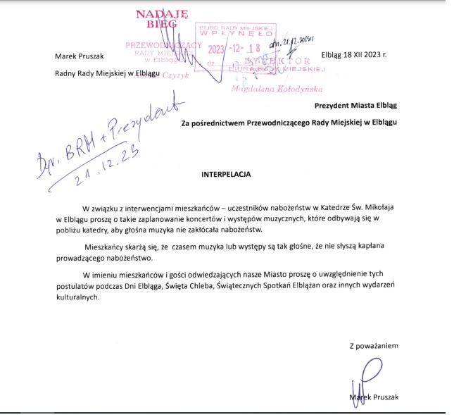 "W związku z interwencjami mieszkańców - uczestników nabożeństw w Katedrze św. Mikołaja w Elblągu, proszę o takie zaplanowanie koncertów i występów muzycznych, które odbywają się w pobliżu katedry, aby głośna muzyka nie zakłócała nabożeństw. Mieszkańcy skarżą się czasem, że muzyka lub występy są tak głośne, że nie słyszą kapłana prowadzącego nabożeństwo. W imieniu mieszkańców i gości odwiedzających nasze Miasto proszę o uwzględnienie tych postulatów podczas Dni Elbląga, Święta Chleba, Świątecznych Spotkań Elblążan oraz innych wydarzeń kulturalnych" - wskazuje radny klubu PiS Marek Pruszak.