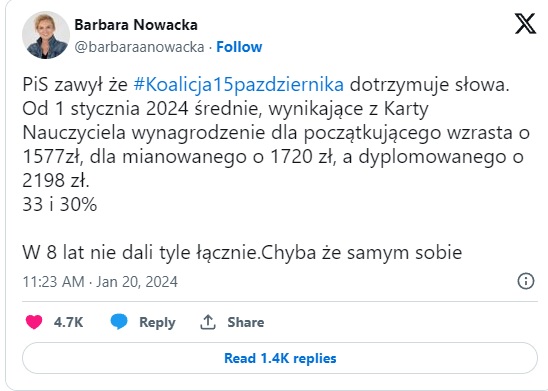 "Podwyżka, która będzie miała miejsce w tym roku: po pierwsze w znacznej mierze w 60% została zabezpieczona, sfinansowana, przygotowana przez rząd PIS, a nauczyciele nie otrzymają 1500 zł do podstawy, okazało się, ze to kolejna niezrealizowana obietnica"