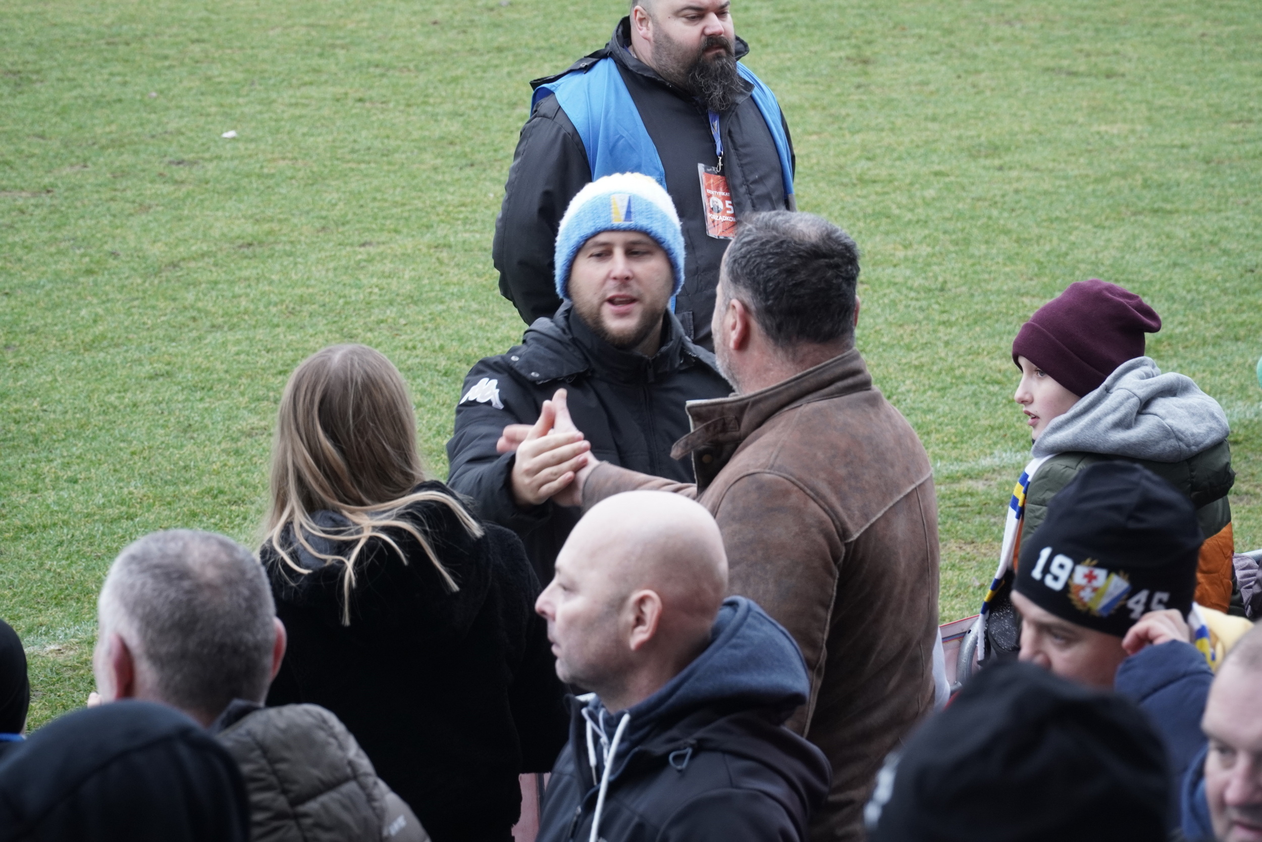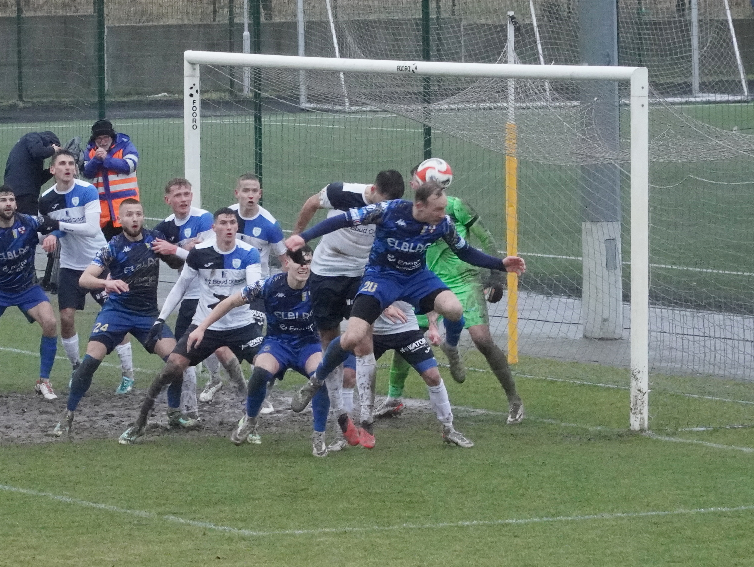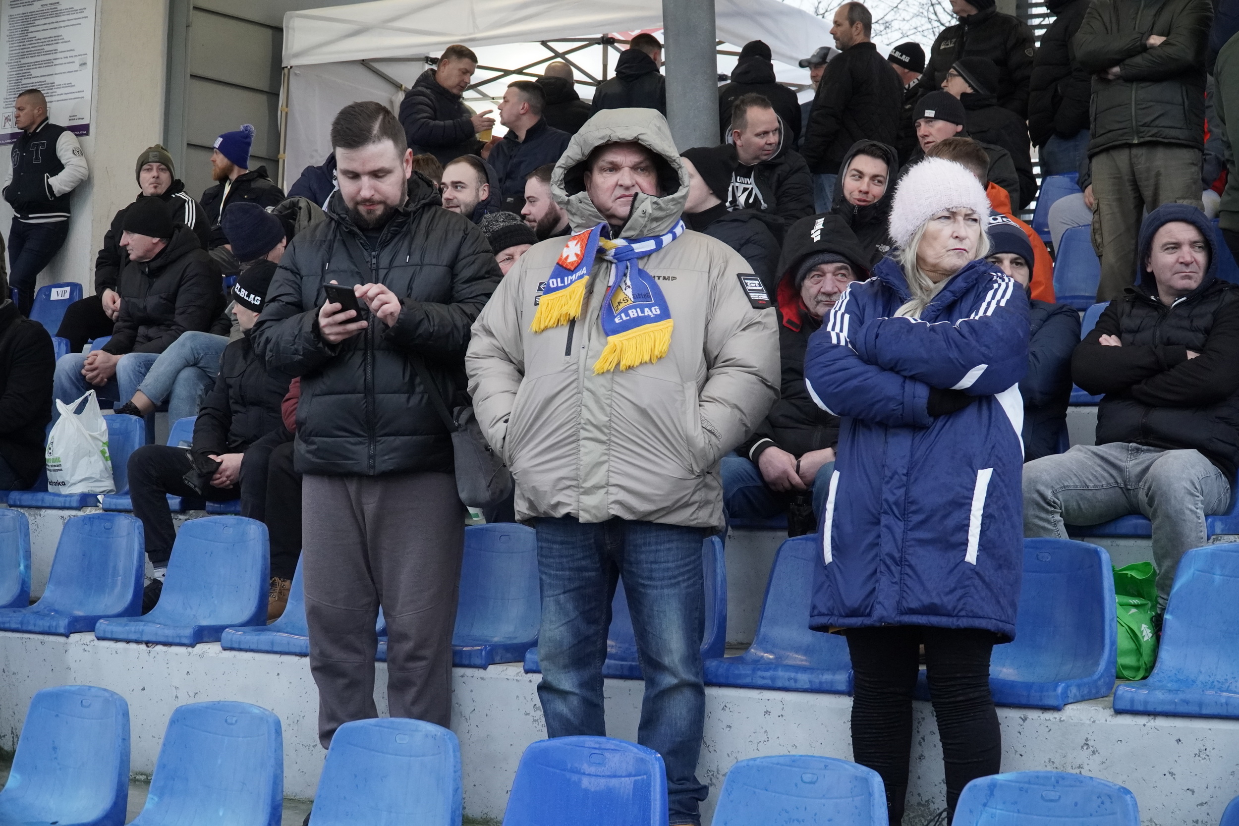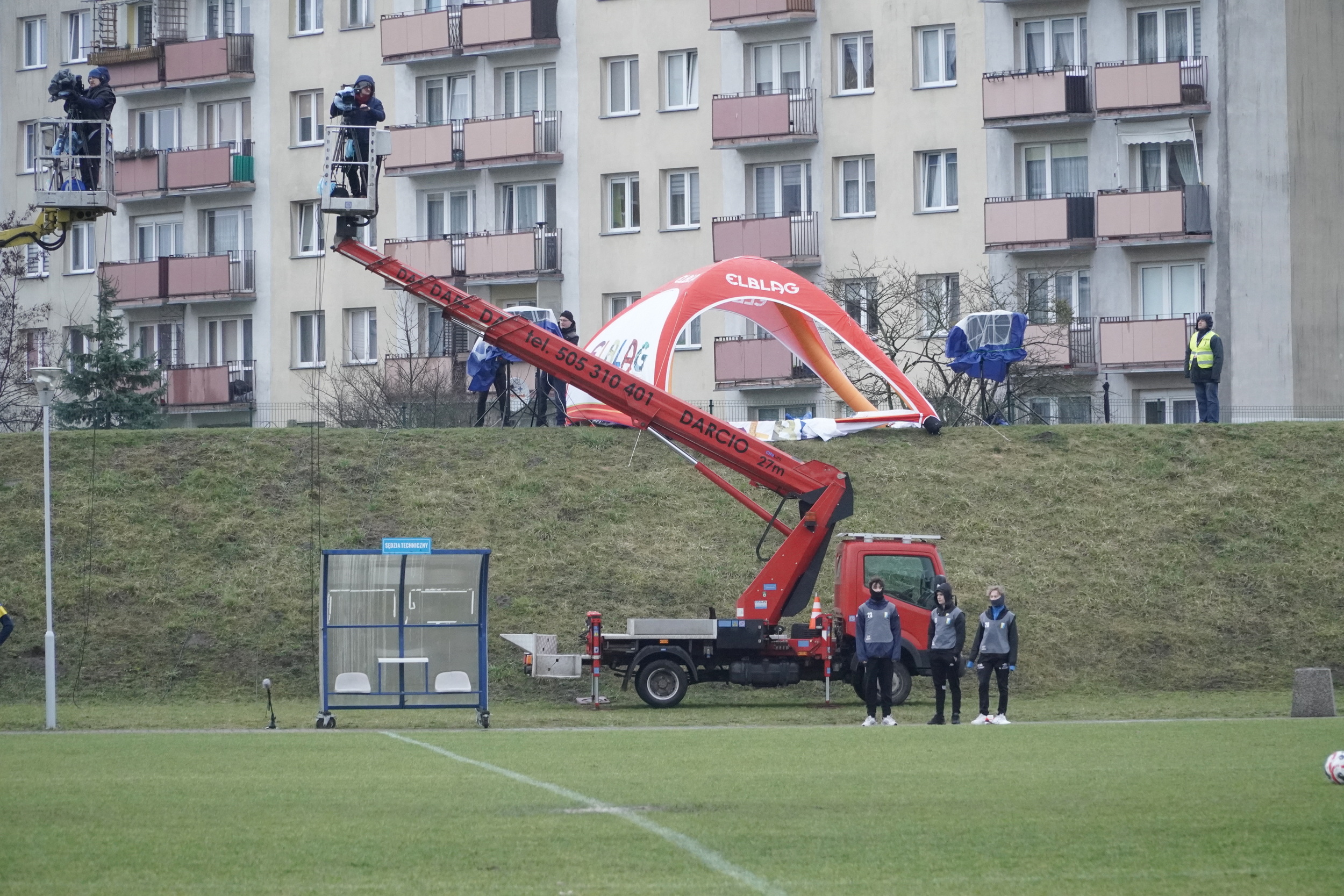 Przeniesiony na stadion przy ul. Skrzydlatej mecz o punkty w drugiej lidze, był wyjątkowym wydarzeniem. Klimatycznie wyglądały podnośniki, stojące na tle bloków Zatorza, z których realizowano transmisję w TVP Sport. Na trybunie zasiadło kilkaset osób, była gastronomia oraz grupa aktywnych fanów elblążan. Na piłkochwytach pojawiły się transparenty kibiców: