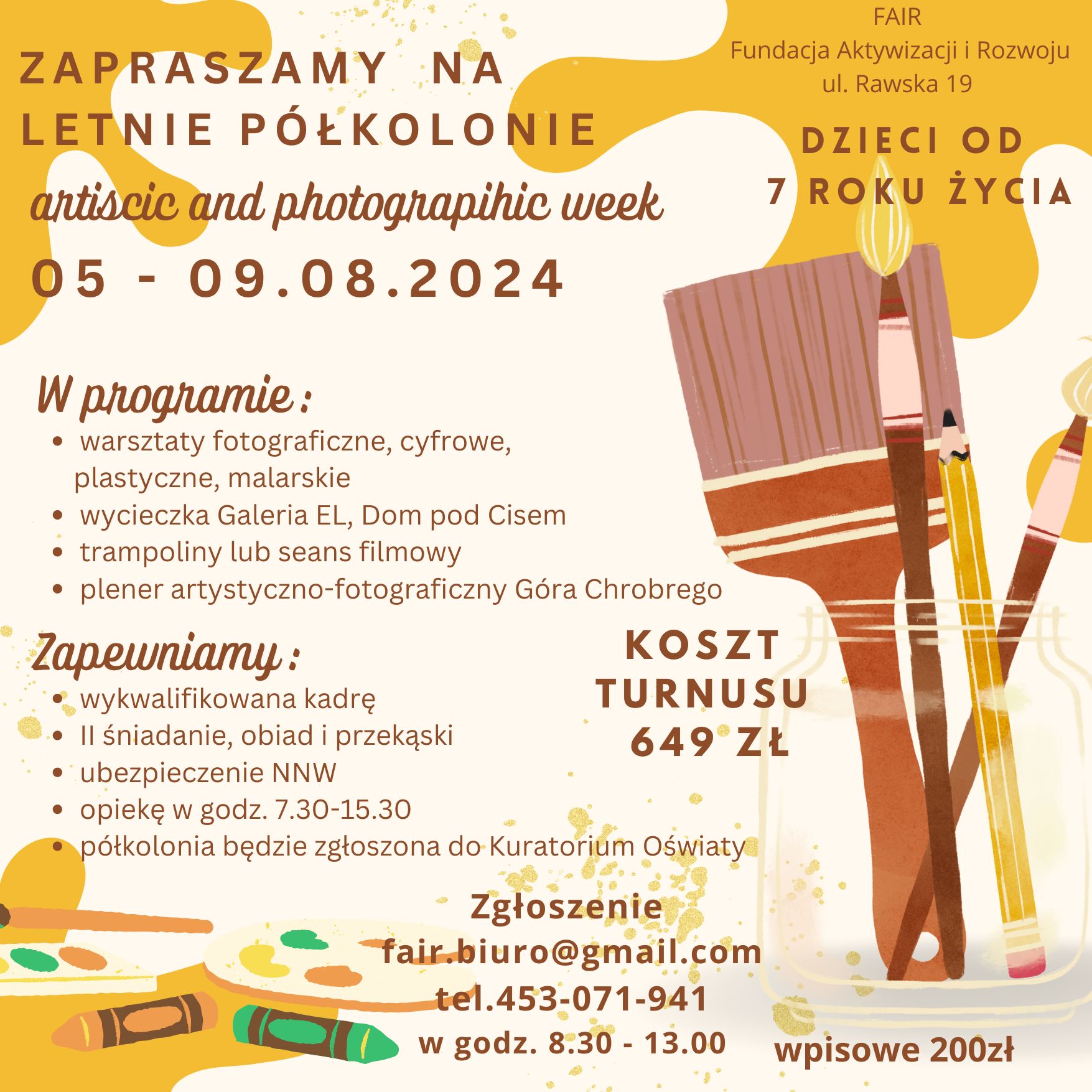 - Od 5 do 9 sierpnia 2024 r. w ramach Artistic and Photographic Week dzieci odkryją w sobie artystów. To doskonała okazja, by rozwinąć swoje talenty plastyczne i fotograficzne.