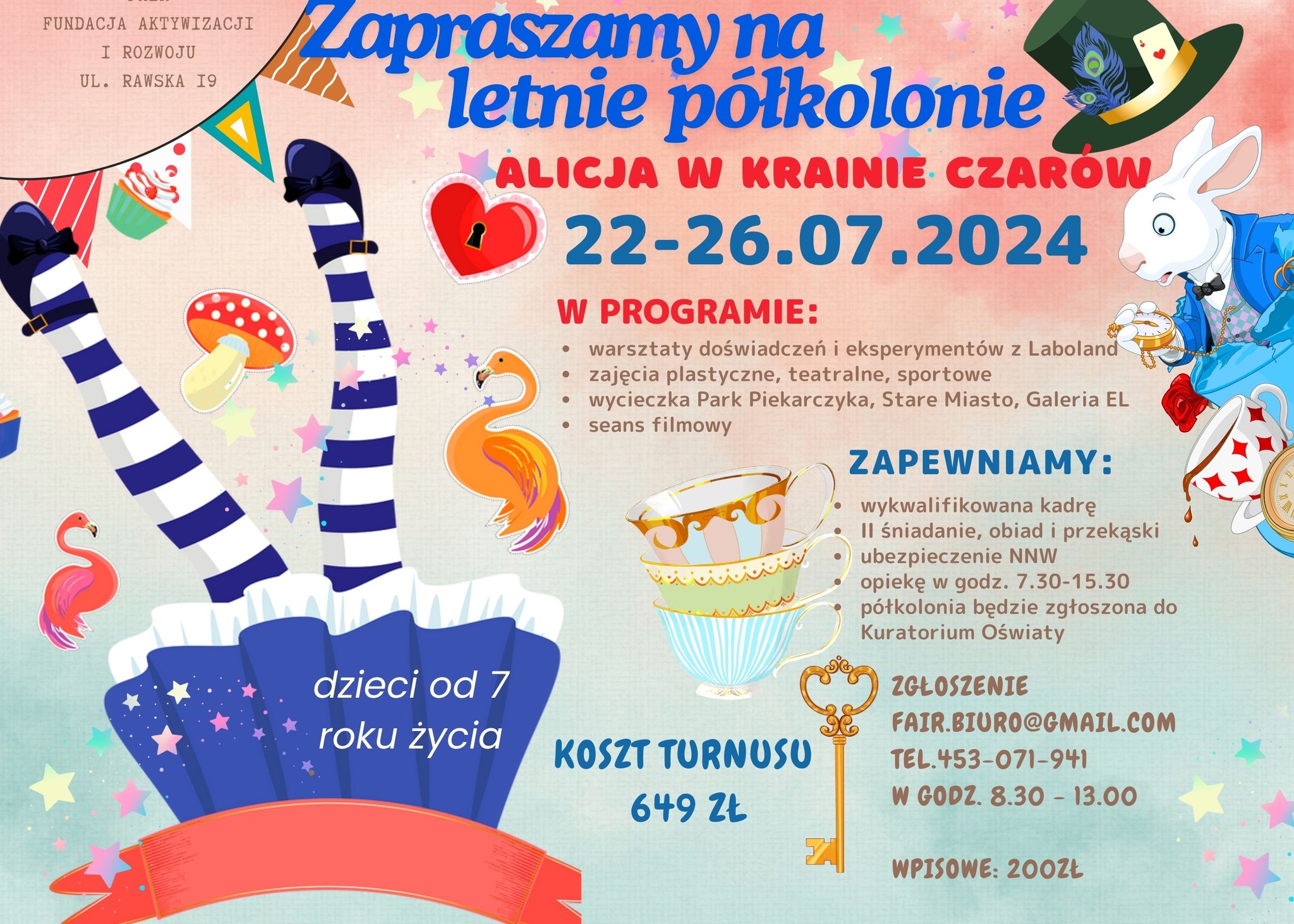 - Od 22 do 26 lipca 2024 r. mali podróżnicy wyruszą na niezwykłą przygodę do Krainy Czarów razem z Alicją. Ta tematyczna półkolonia z pewnością pobudzi wyobraźnię i zainspiruje do kreatywnej zabawy.