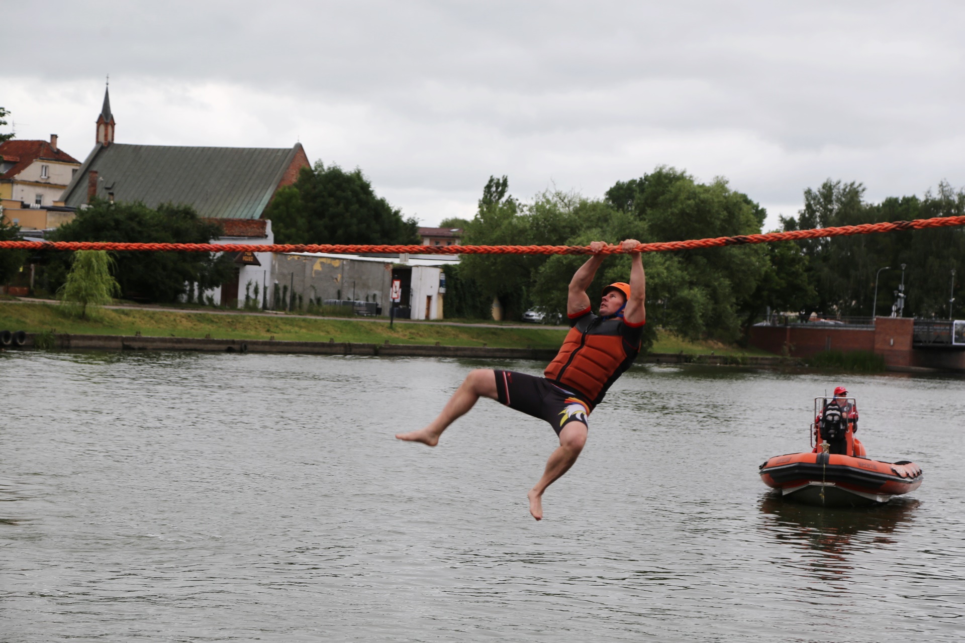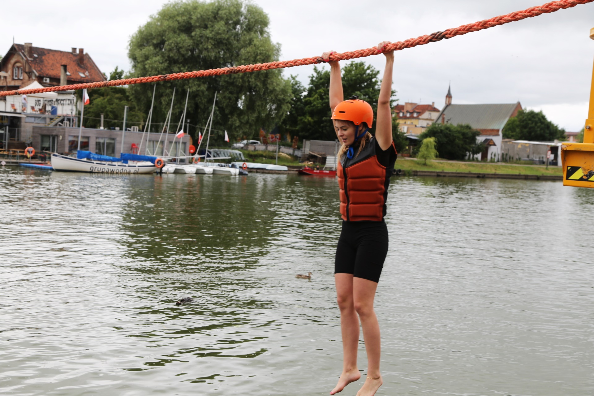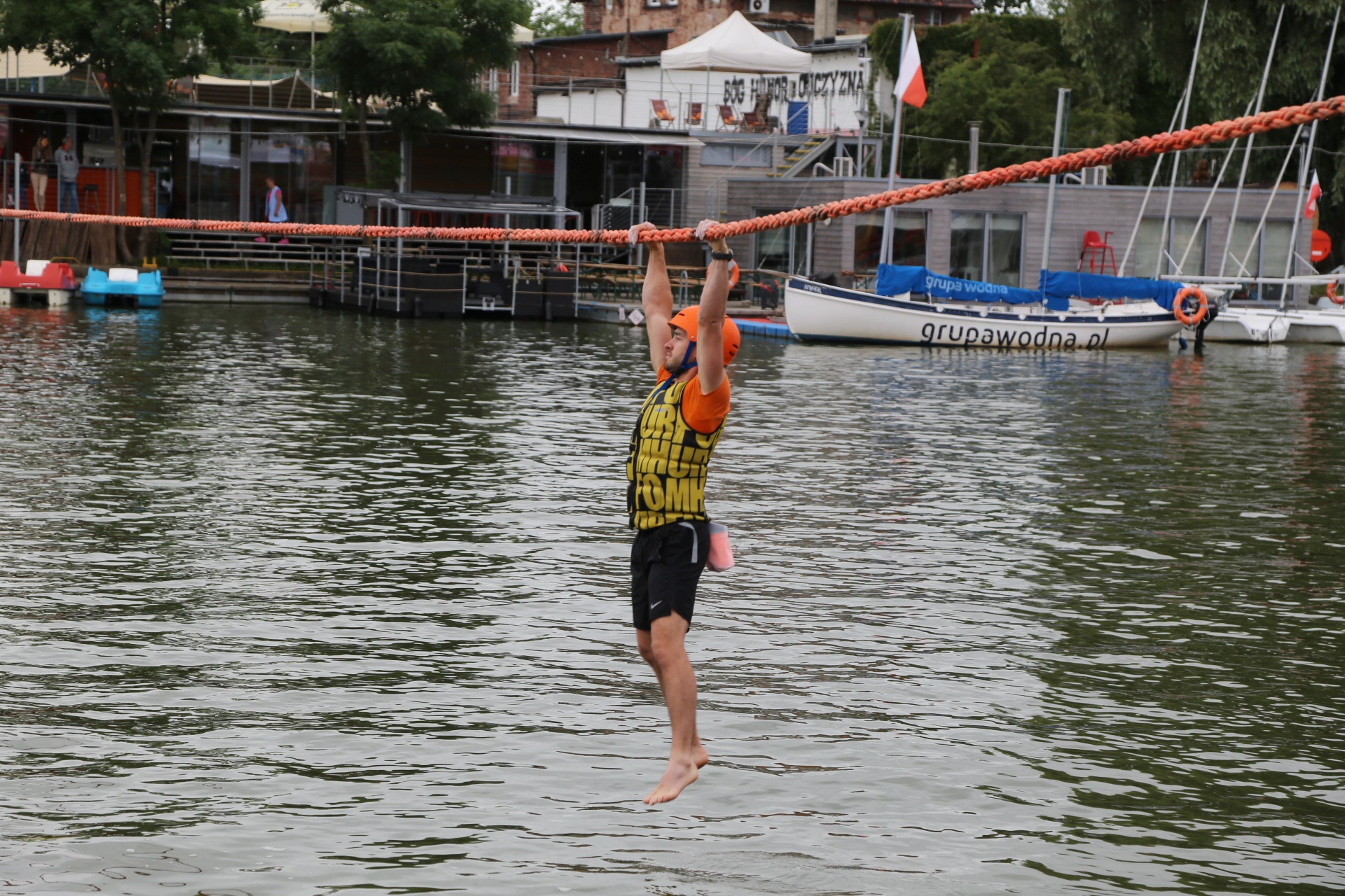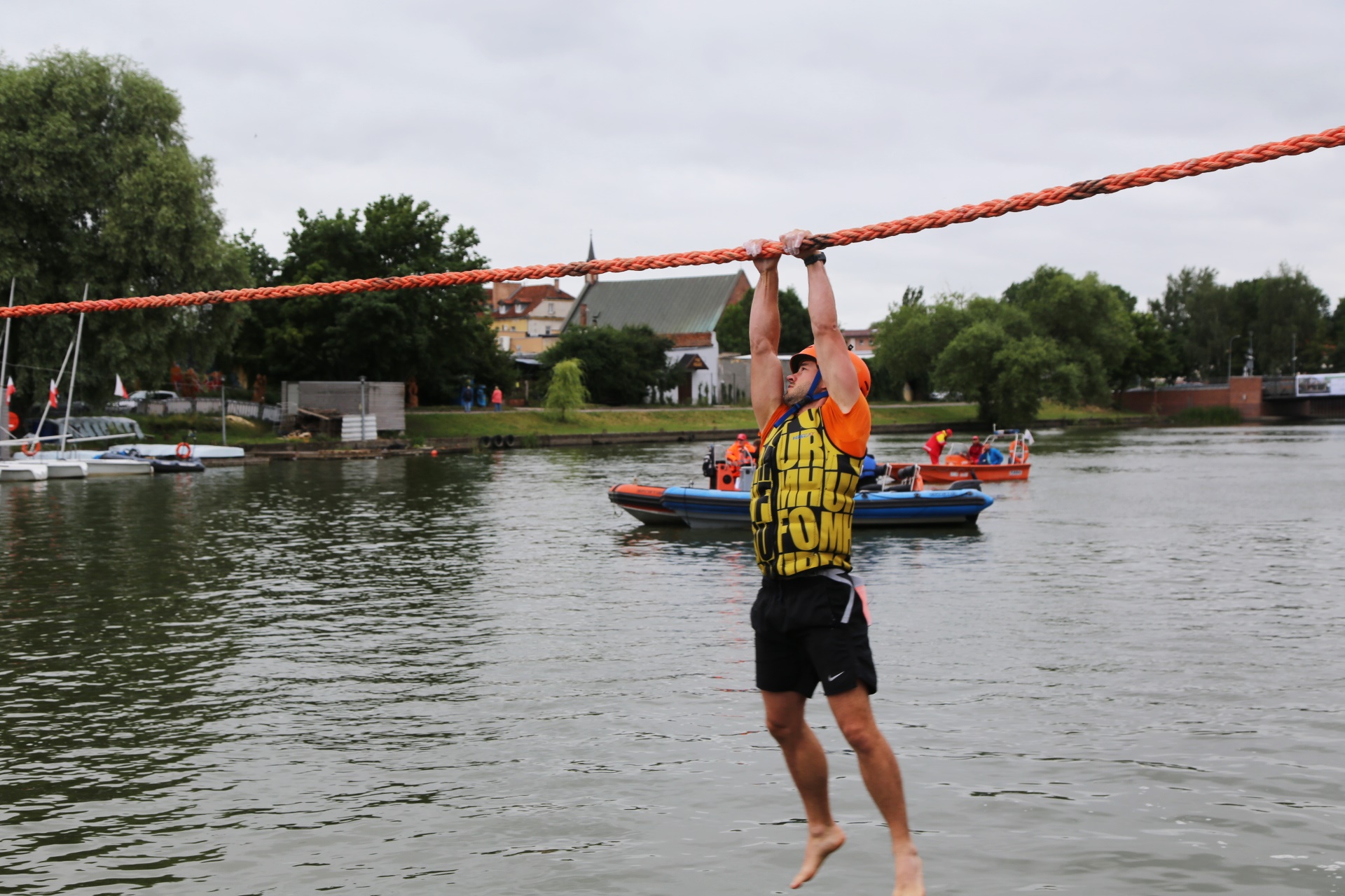 Zadanie jest proste w teorii, ale wymagające w wykonaniu: przeprawa nad rzeką Elbląg za pomocą liny, wykorzystując jedynie własną siłę rąk.