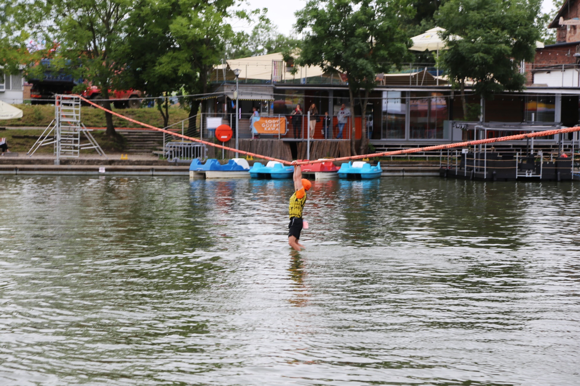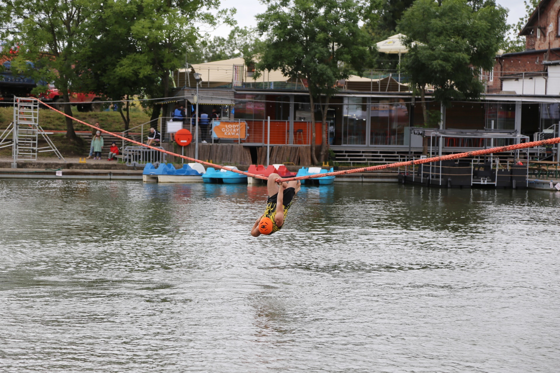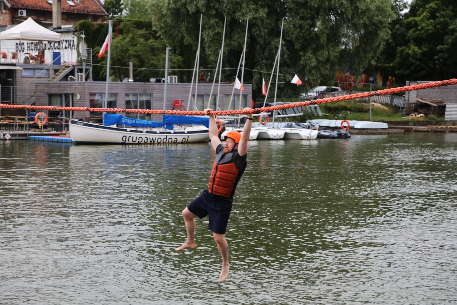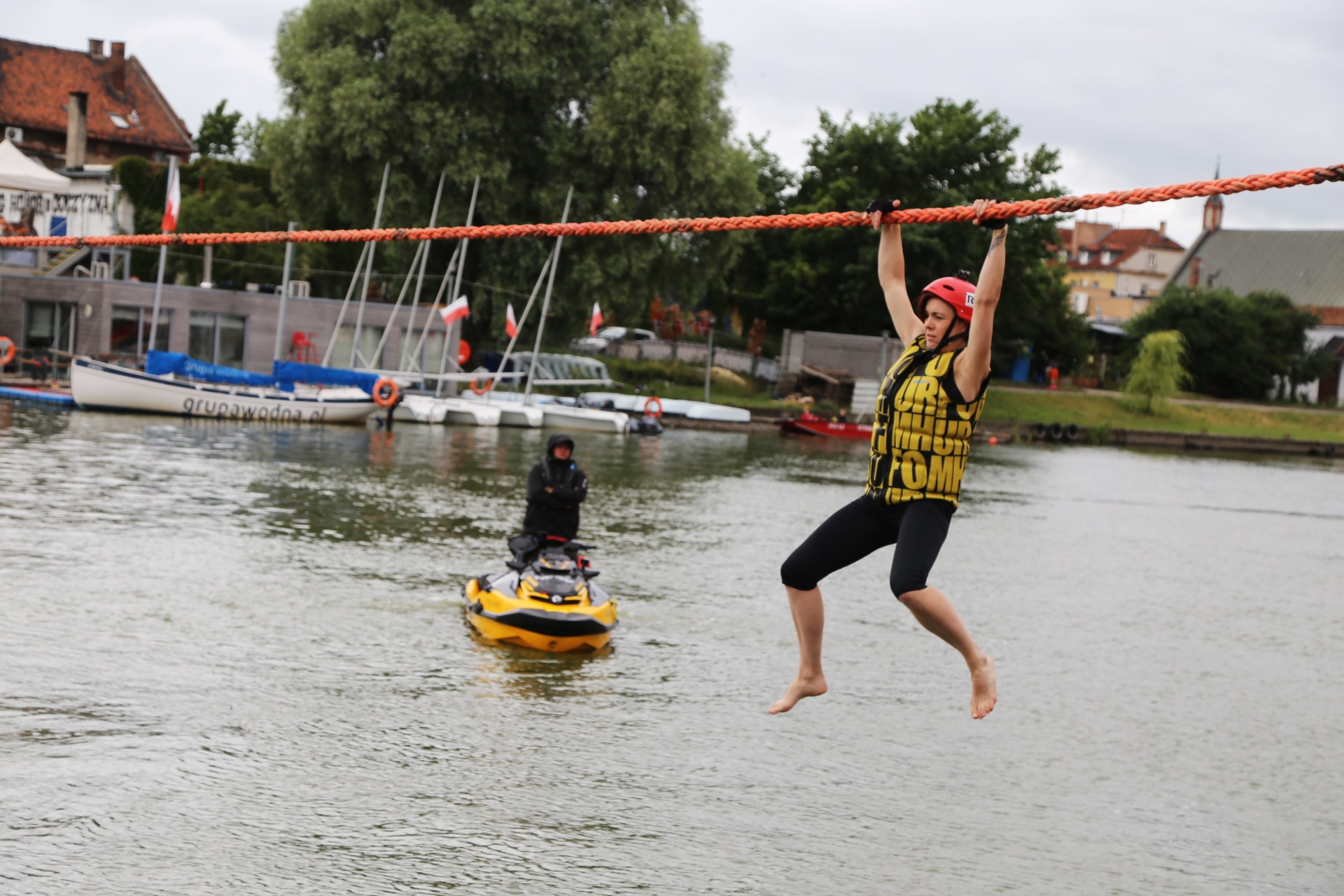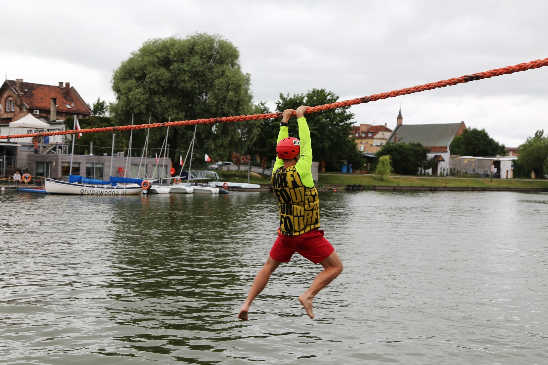 Zadanie jest proste w teorii, ale wymagające w wykonaniu: przeprawa nad rzeką Elbląg za pomocą liny, wykorzystując jedynie własną siłę rąk.