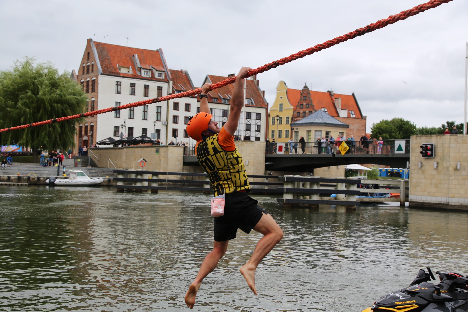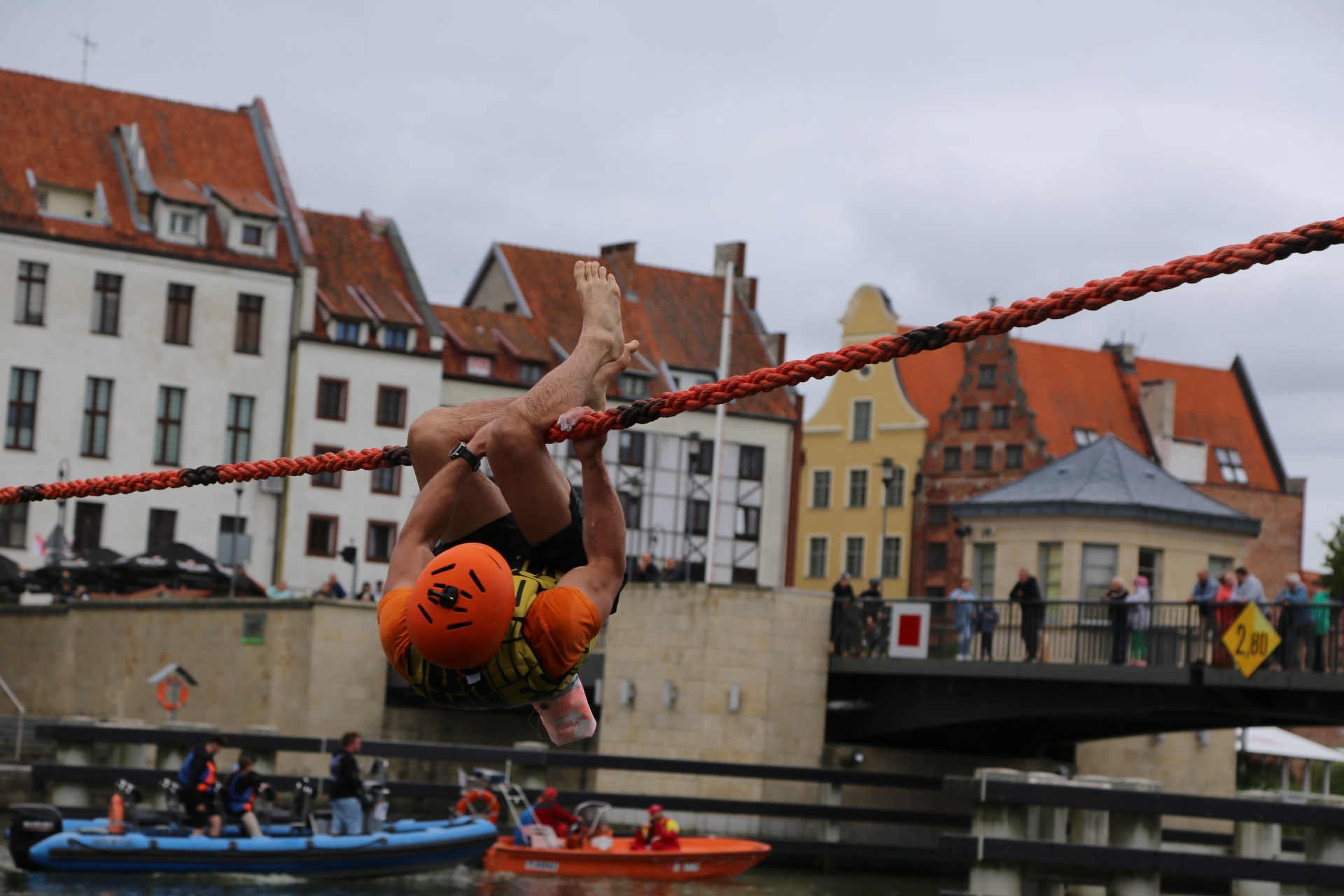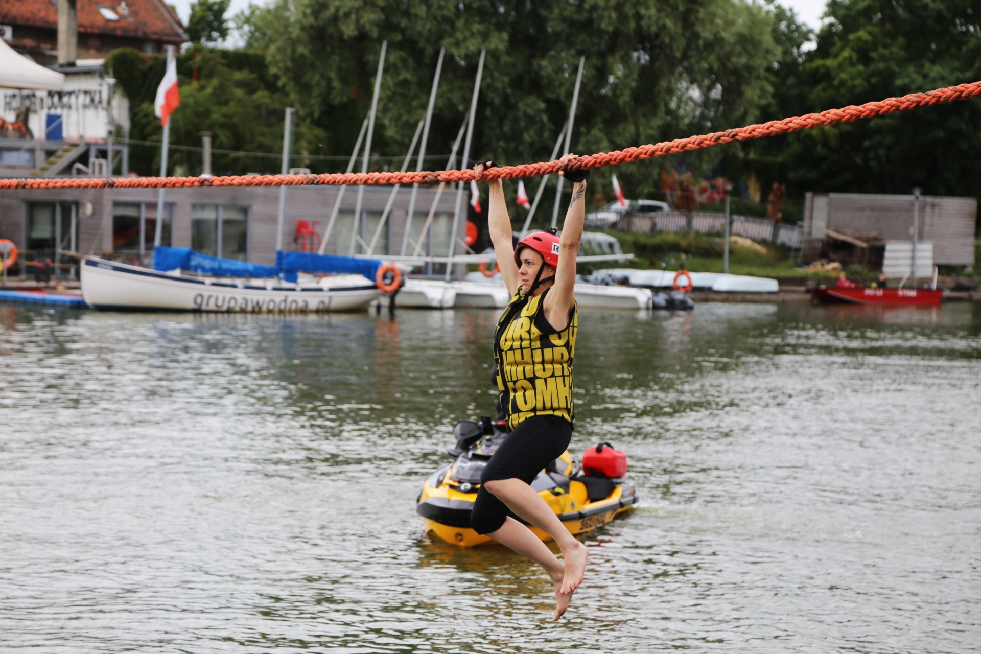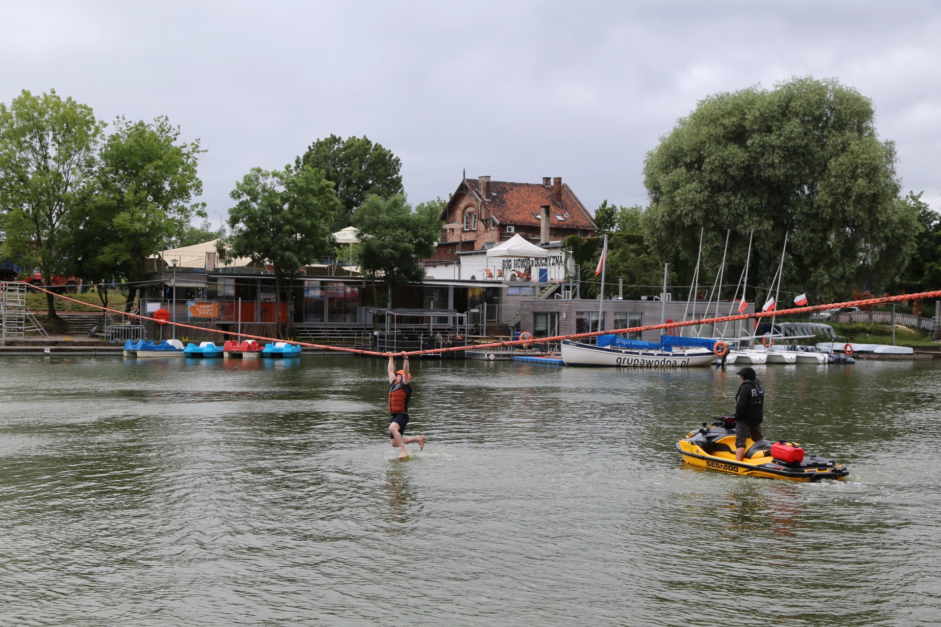 Zadanie jest proste w teorii, ale wymagające w wykonaniu: przeprawa nad rzeką Elbląg za pomocą liny, wykorzystując jedynie własną siłę rąk.