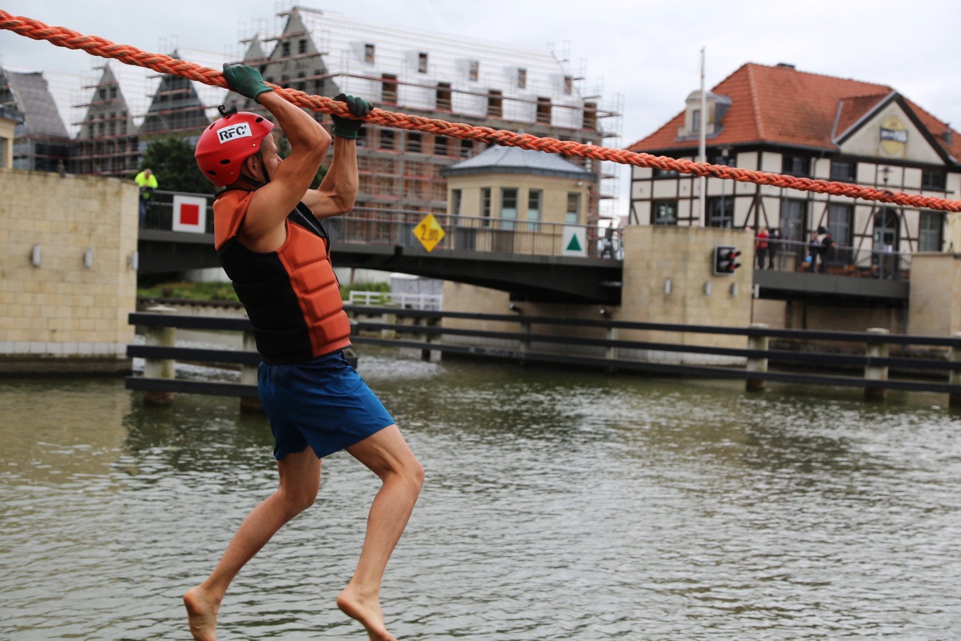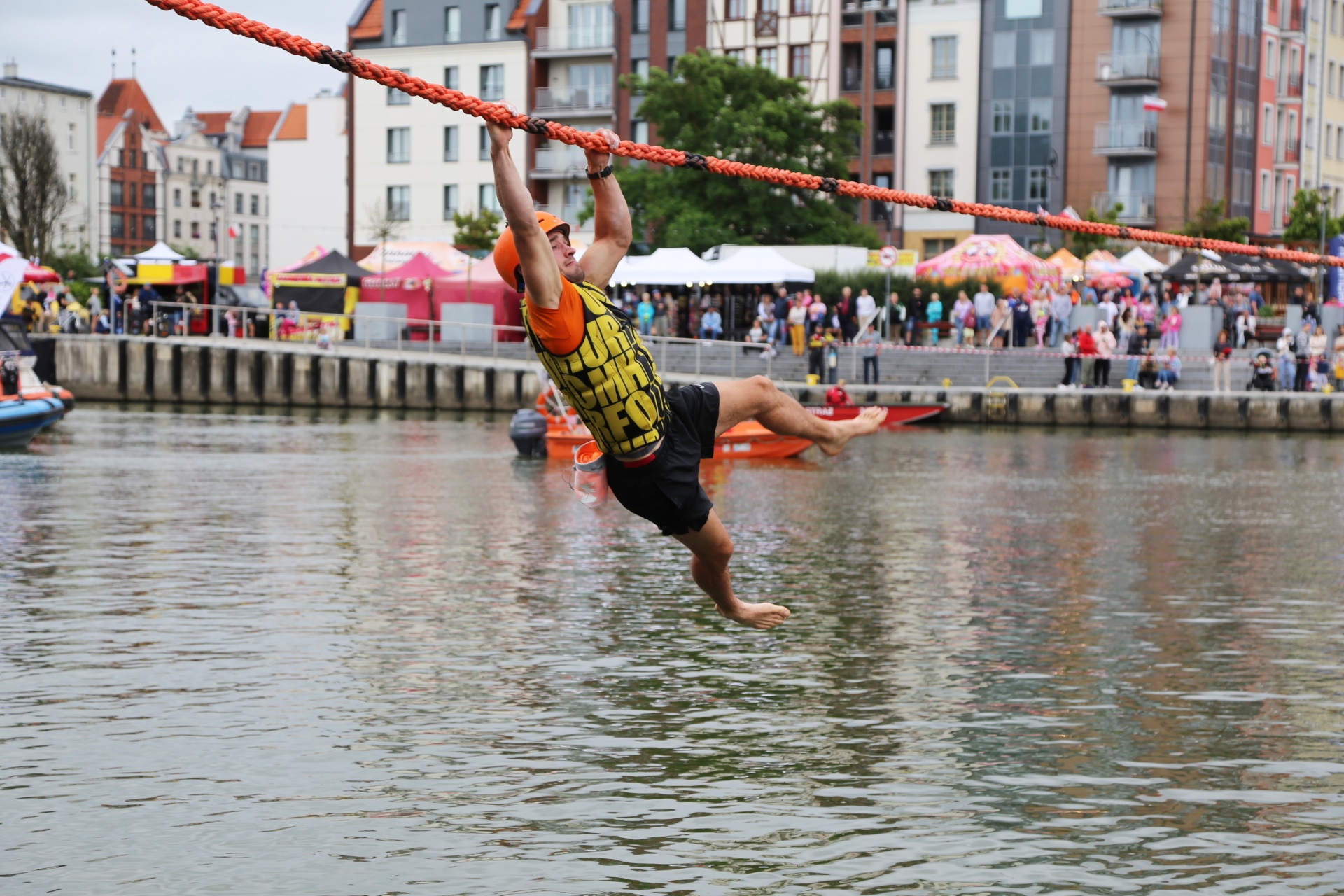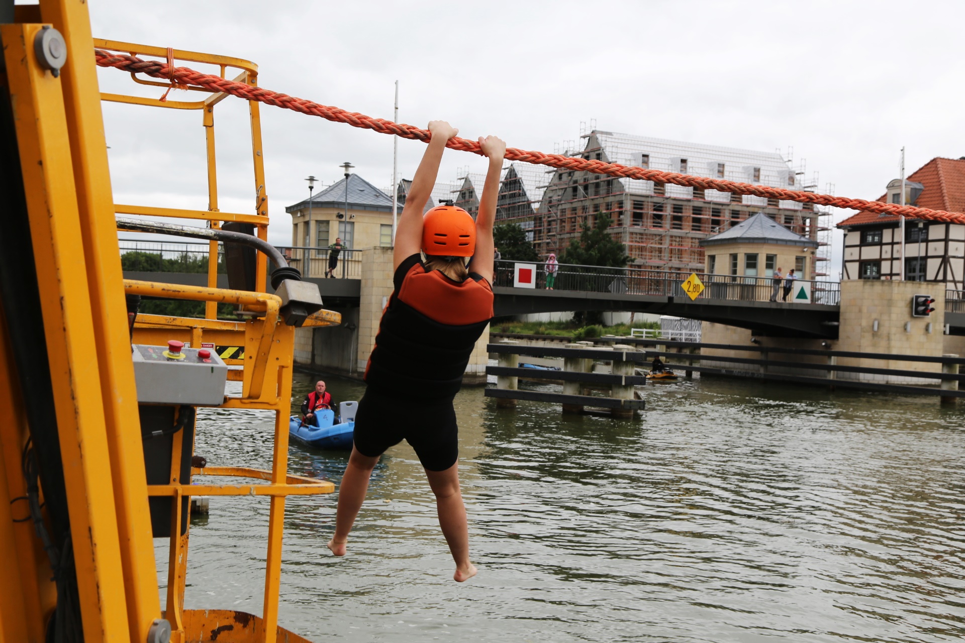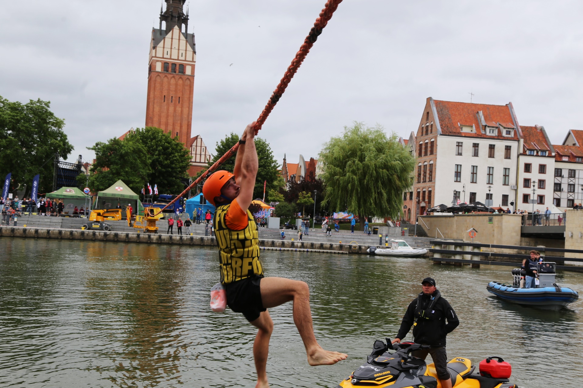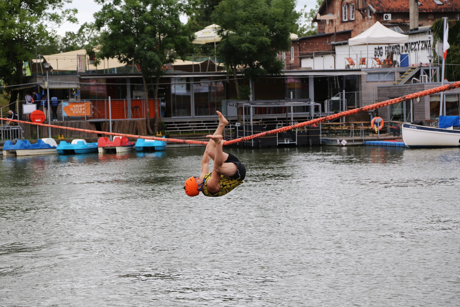 Zadanie jest proste w teorii, ale wymagające w wykonaniu: przeprawa nad rzeką Elbląg za pomocą liny, wykorzystując jedynie własną siłę rąk.