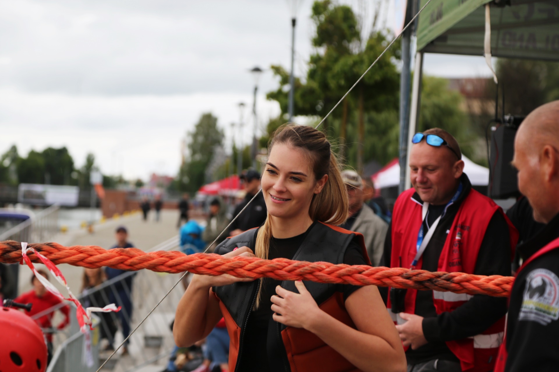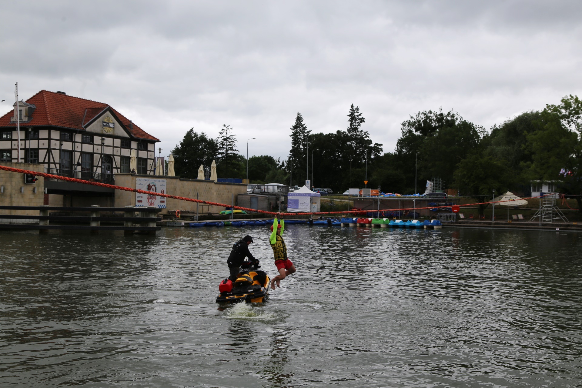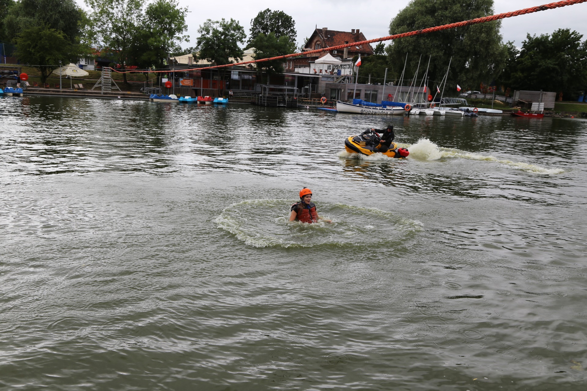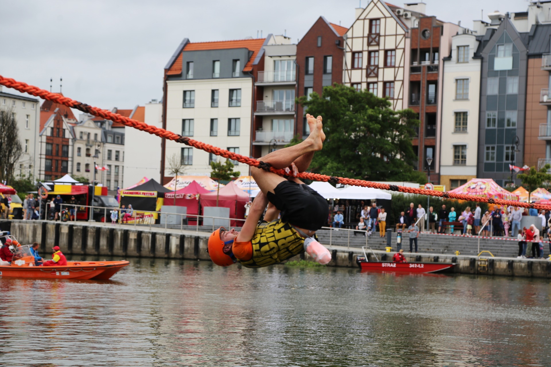 Zadanie jest proste w teorii, ale wymagające w wykonaniu: przeprawa nad rzeką Elbląg za pomocą liny, wykorzystując jedynie własną siłę rąk.