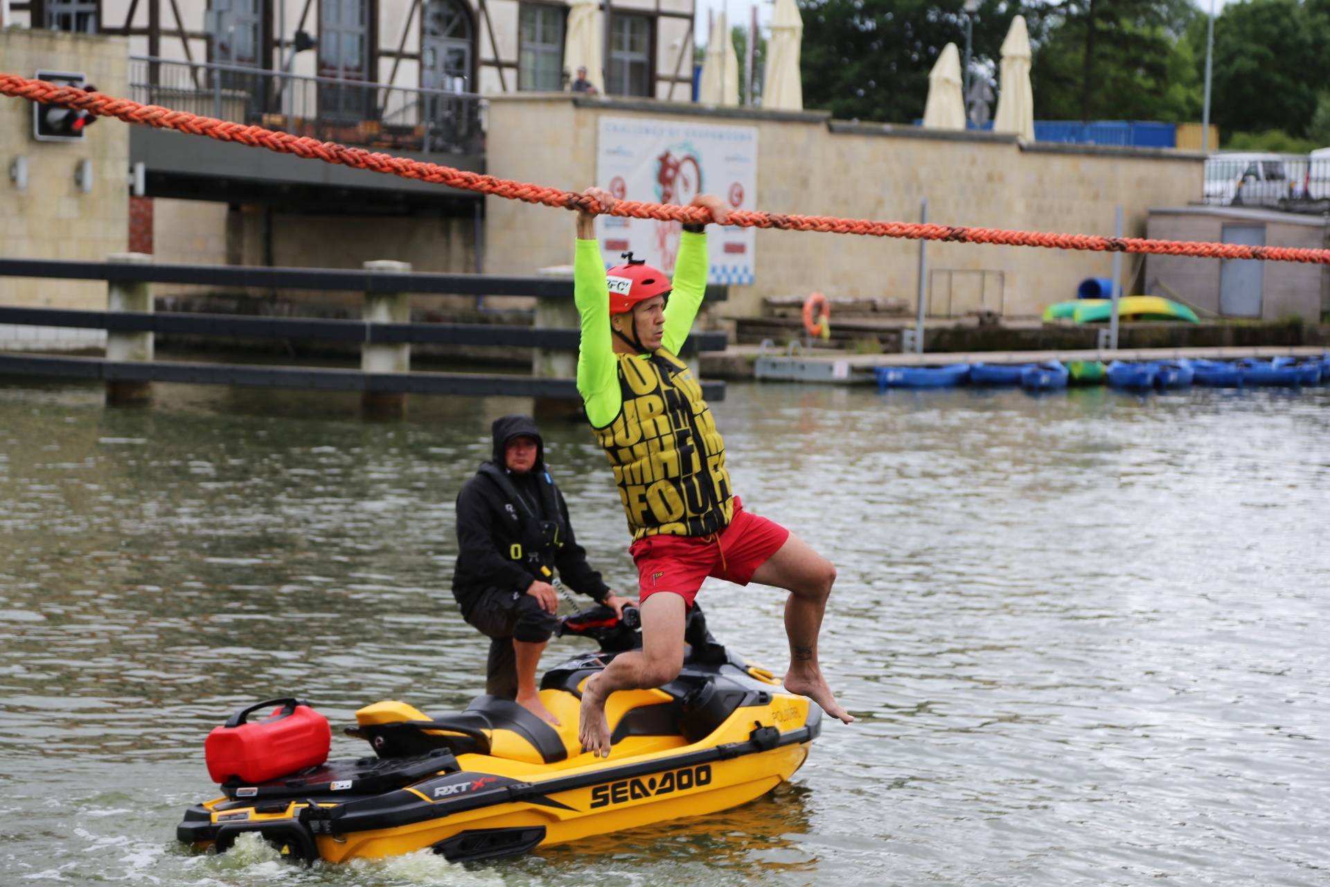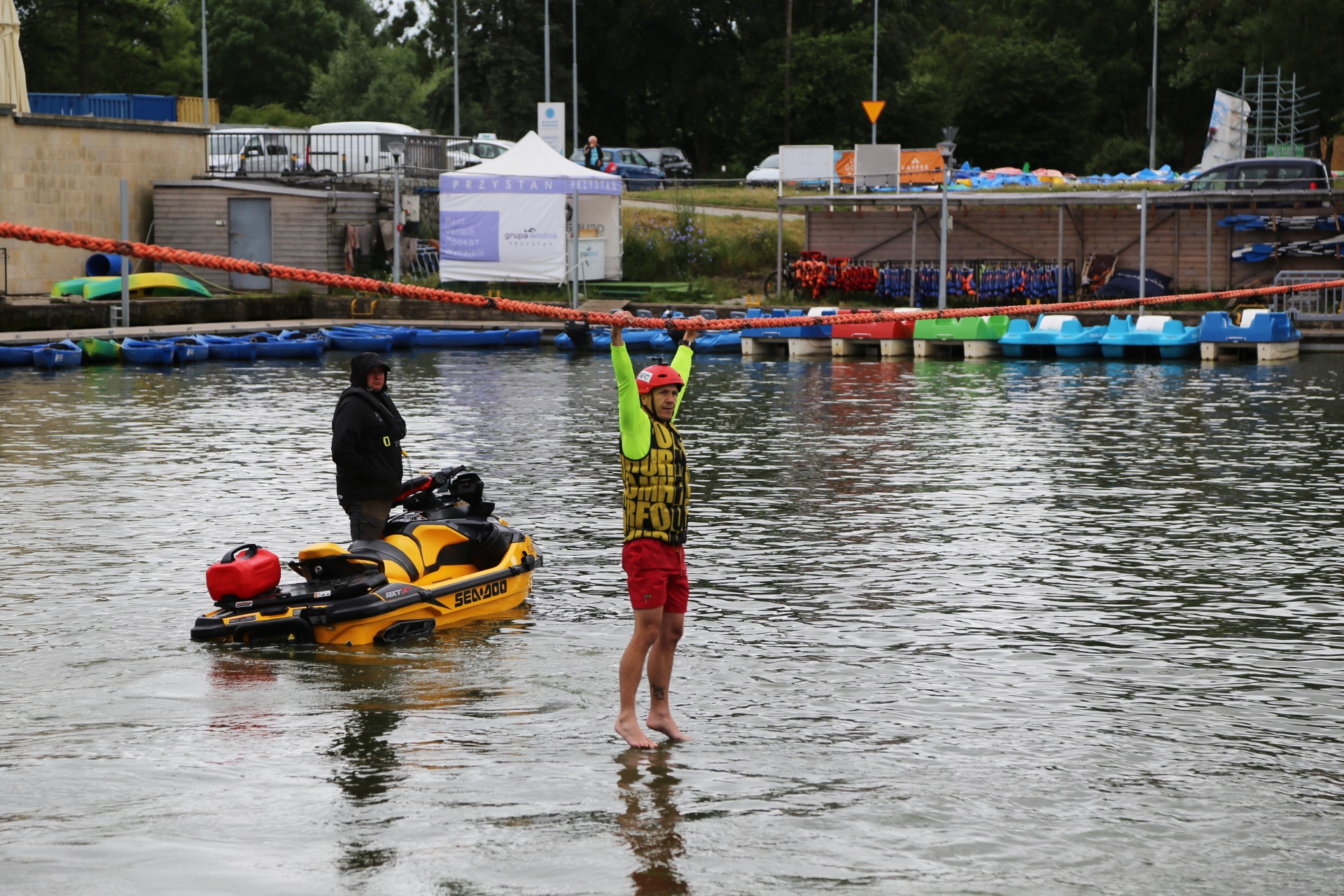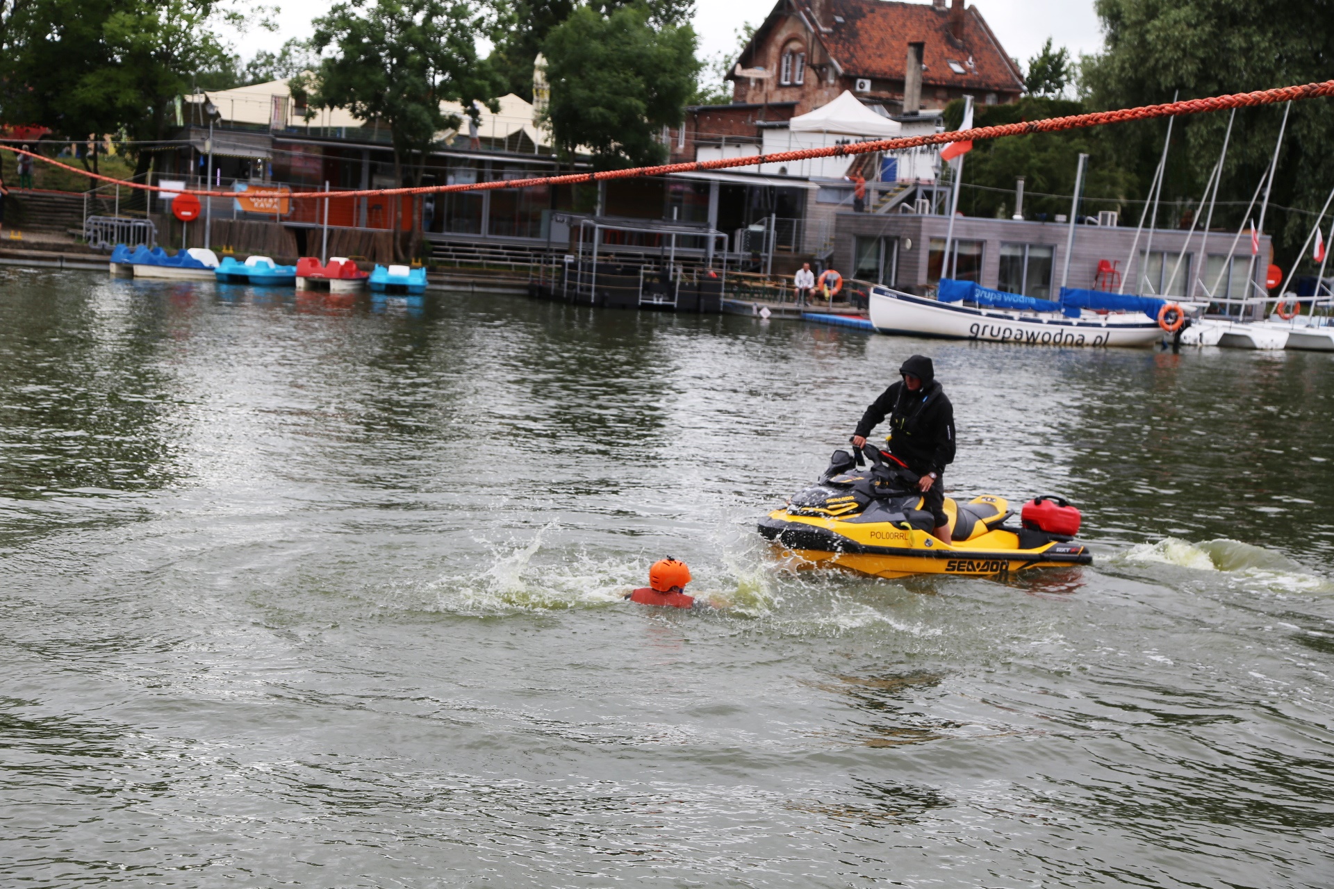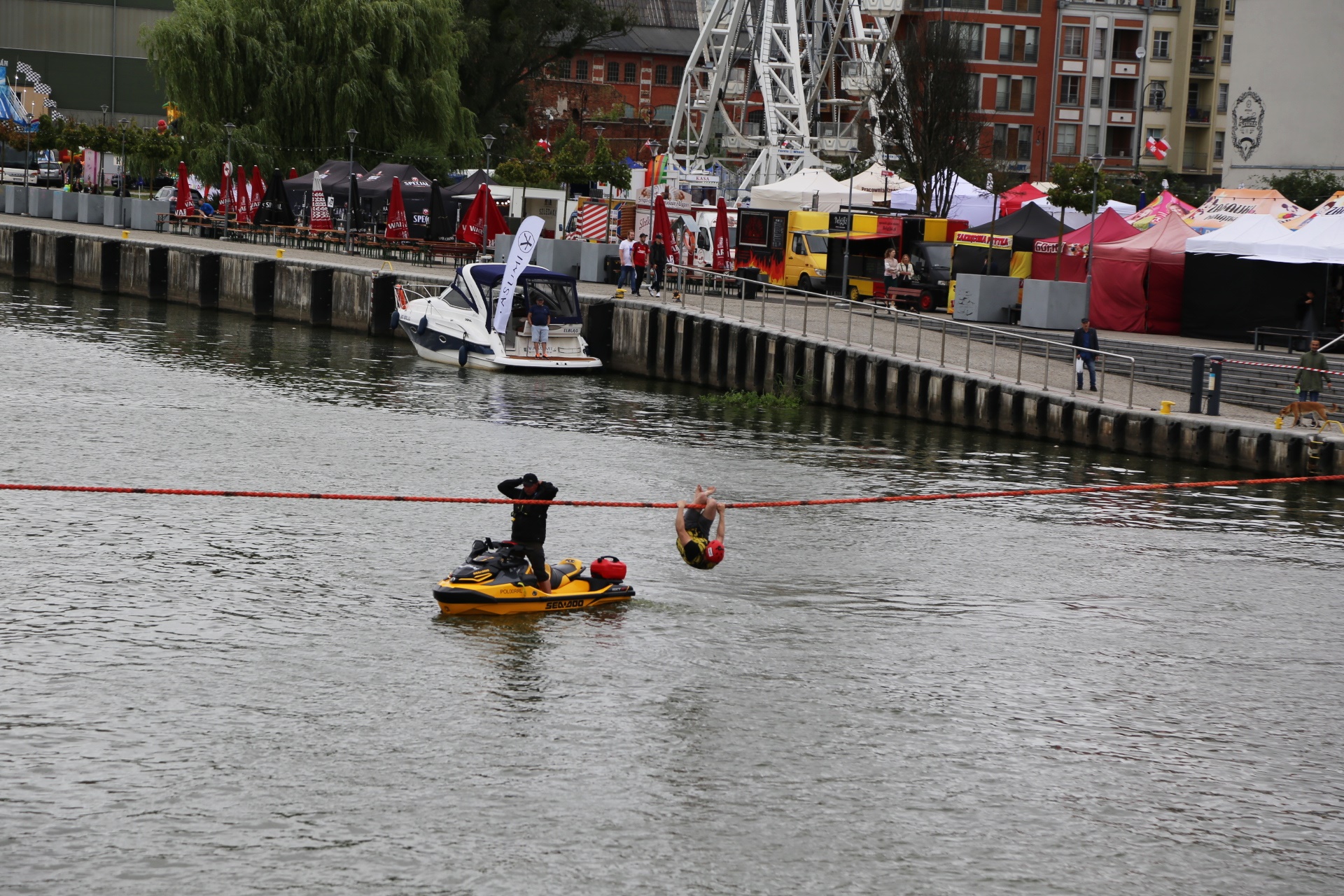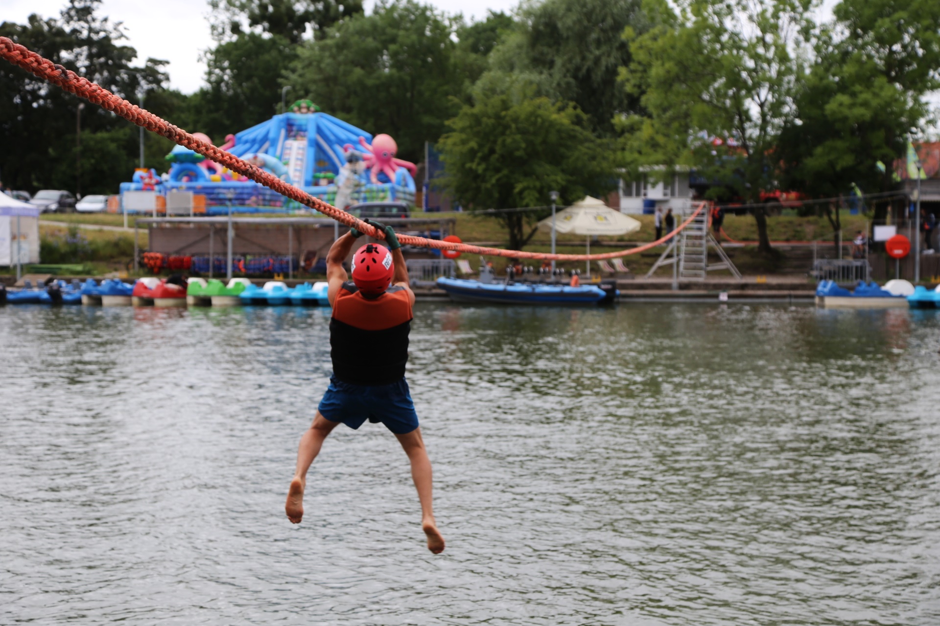 Zadanie jest proste w teorii, ale wymagające w wykonaniu: przeprawa nad rzeką Elbląg za pomocą liny, wykorzystując jedynie własną siłę rąk.