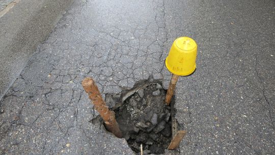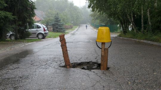 Miejsce zapadnięcia się asfaltu zostało zabezpieczone słupkami. Dziś, 11 lipca ruszyły prace nad usunięciem awarii.