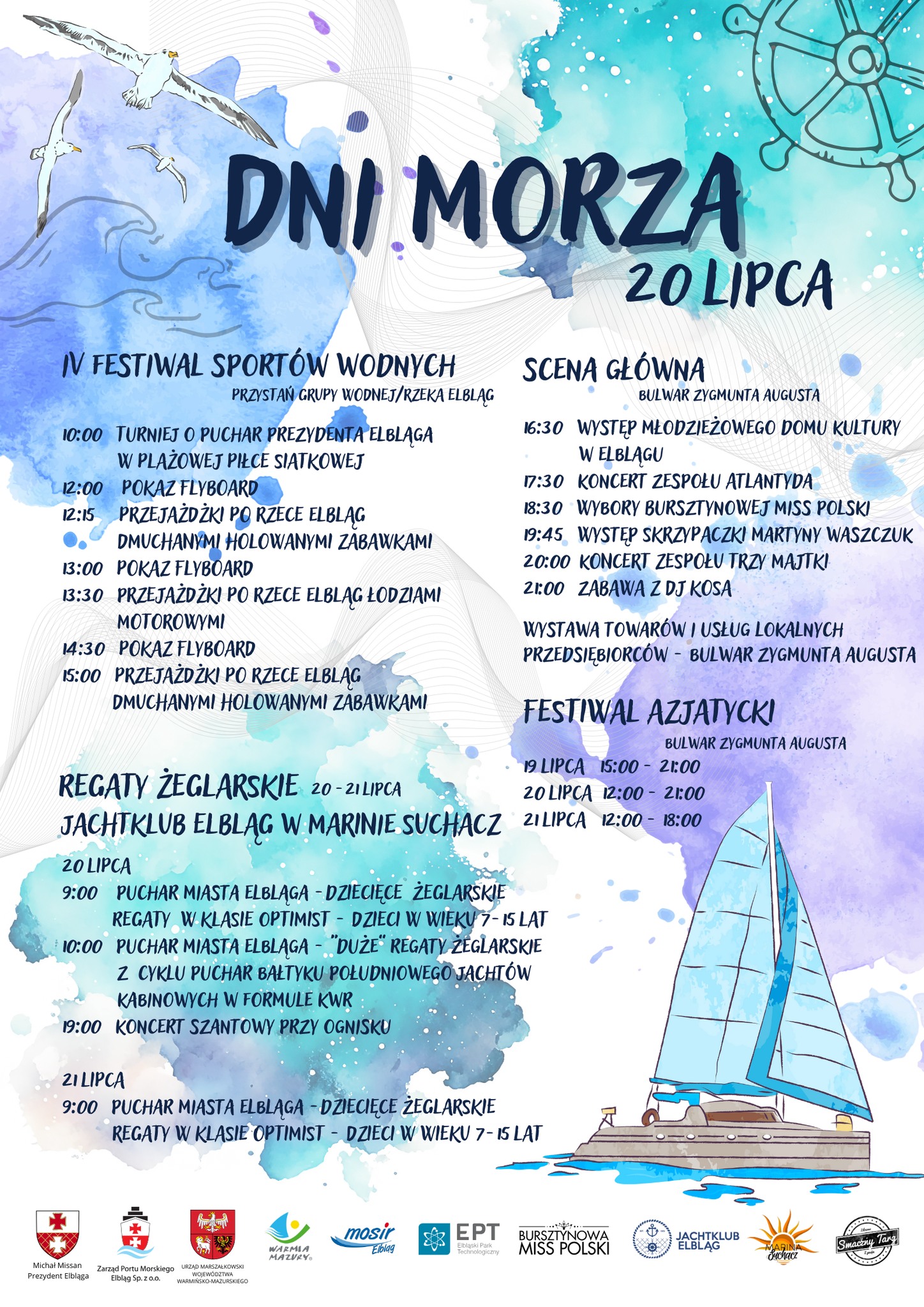 Dni Morza to szereg wydarzeń, które odbędą się w dniach 19-21 lipca. W Elblągu w sobotę 20 lipca odbędzie się IV Festiwal Sportów Wodnych organizowany przez Miejski Ośrodek Sportu i Rekreacji w Elblągu (godz. 12-16). Zaplanowana w ramach wydarzenia jest również wystawa produktów i usług branży morskiej. Tego dnia wiele ciekawego będzie działo się na scenie ustawionej na Bulwarze Zygmunta Augusta w pobliżu rzeki Elbląg. Wystąpią młodzi artyści z Młodzieżowego Domu Kultury w Elblągu, odbędą się wybory Bursztynowej Miss Polski, a także usłyszymy dwa zespoły prezentujące muzyką żeglarską: Atlantyda oraz Trzy Majtki. Całość zwieńczy zabawa z DJ Kosą. Na miłośników kulinarnych podróży czeka Festiwal Smaków Azjatyckich, podczas którego będzie można spróbować dań z różnych zakątków Azji. Dodatkowo na Bulwarze Zygmunta Augusta staną Food Trucki oferujące dania z całego świata.