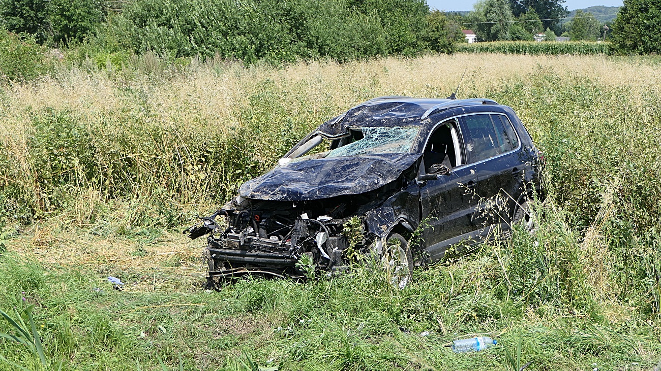 W wyniku zderzenia pojazd marki volkswagen wypadł z drogi wielokrotnie dachując.Trzy osoby podróżujące volkswagenem zostały zabrane do szpitala.