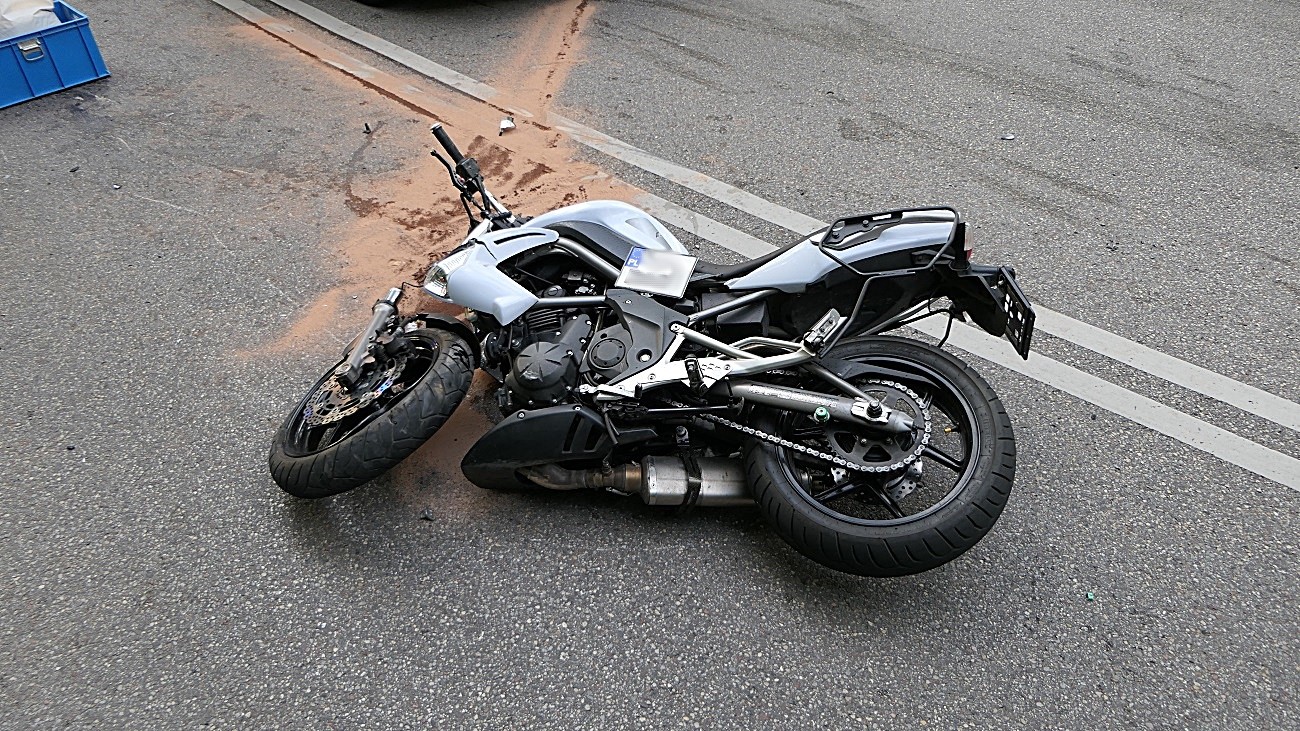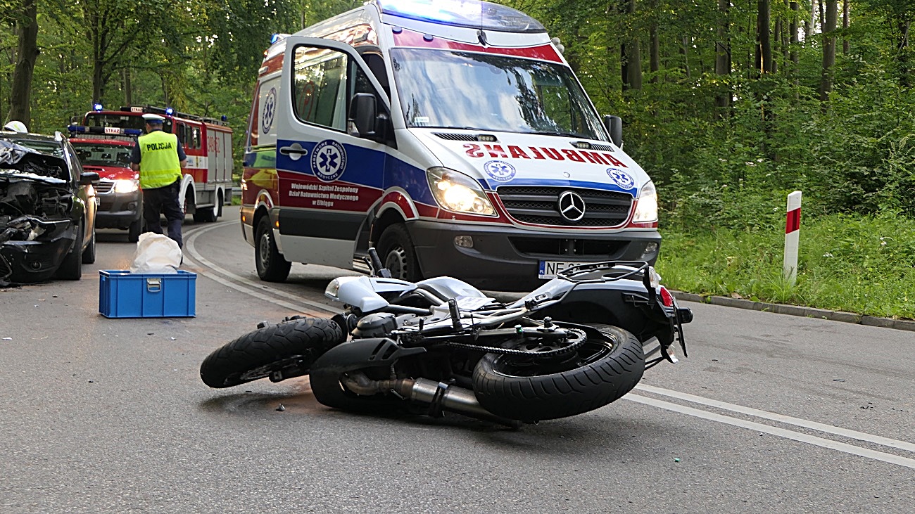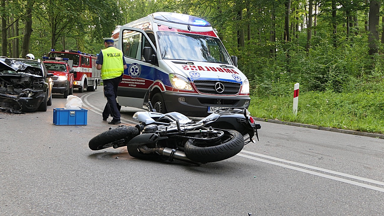 W wypadku ucierpiał 28-letni kierujący motocyklem, ze złamaniami trafił do szpitala.