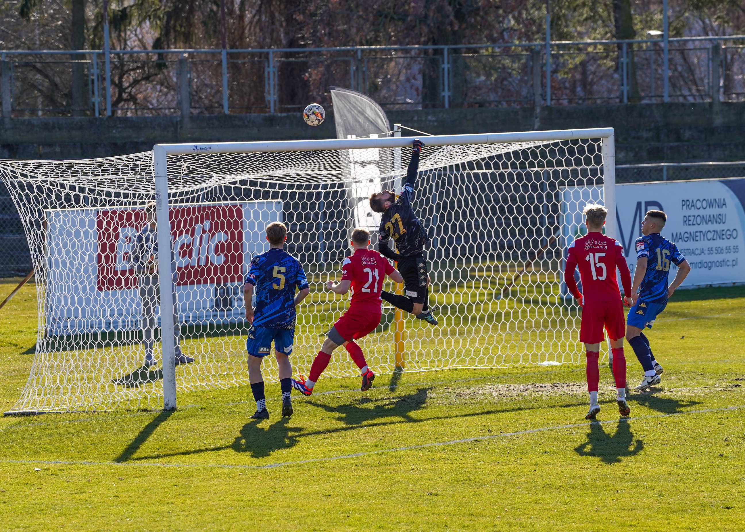 Olimpia zaatakowała na początku, ale postrzale Dominika Kozery i zamieszaniu w polu karnym, piłka nie wturlała się do bramki, bo ktoś ją wybił. W trakcie pierwszej połowy strzał z daleka wypożyczonego z Gdyni Wojciecha Zielińskiego. Futbolówka walnęła w poprzeczkę i wypadła.