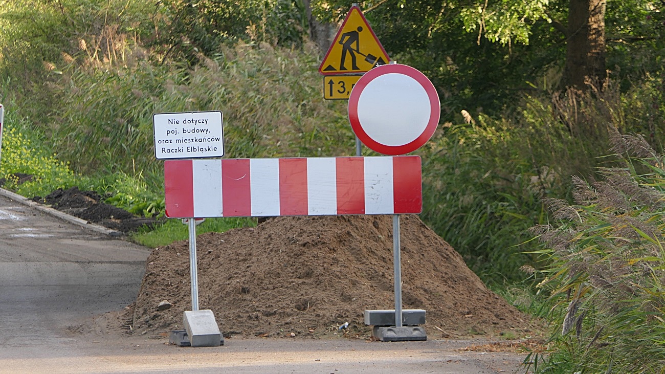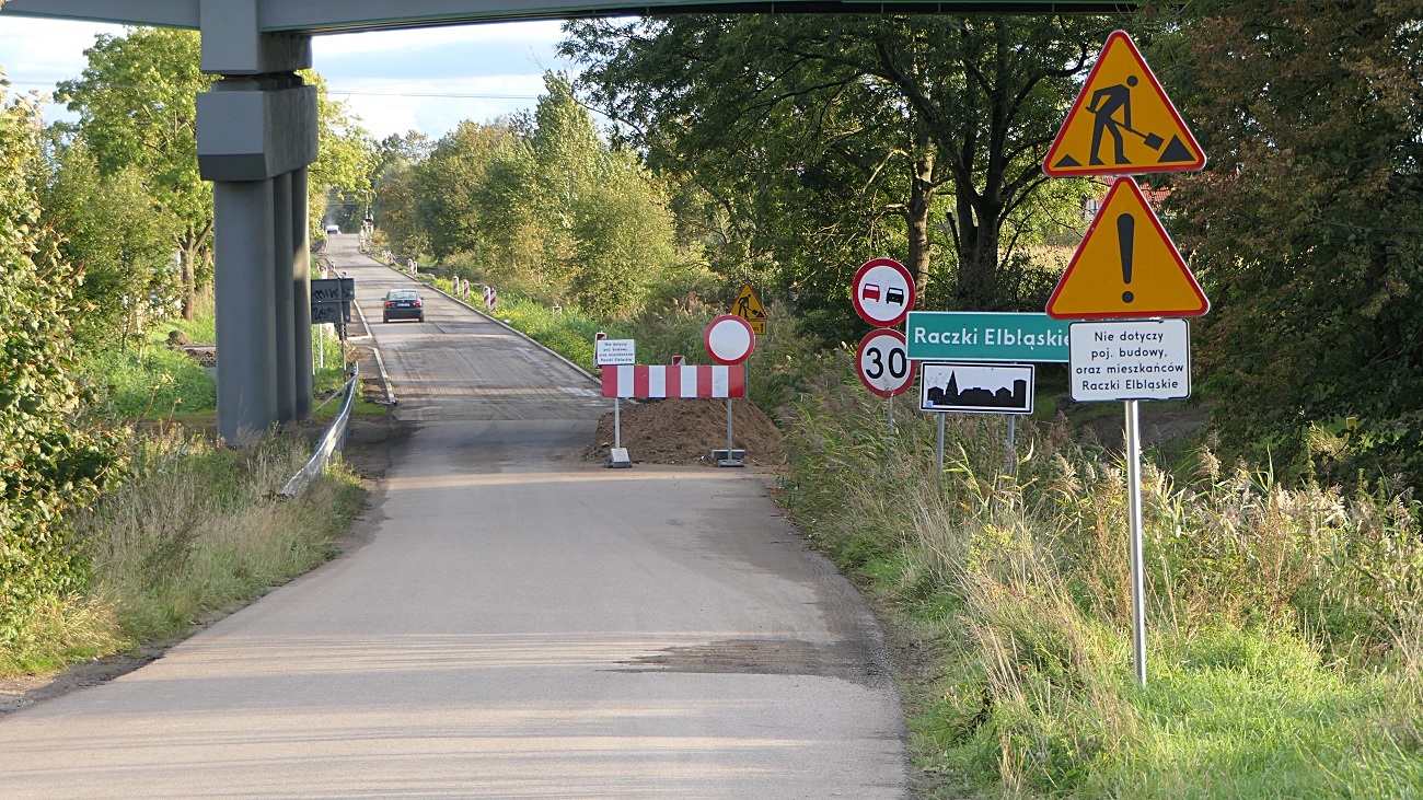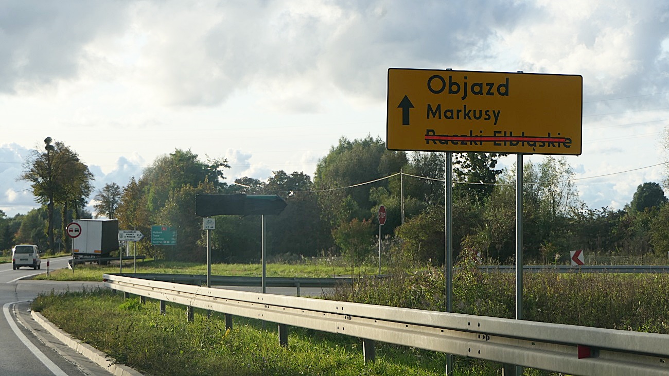 Objazd zgodnie ze zmienioną, tymczasową organizacją ruchu( objazd do Raczki Elbląskie drogami DK22, DP, DP 1126N oraz DP nr1121N)