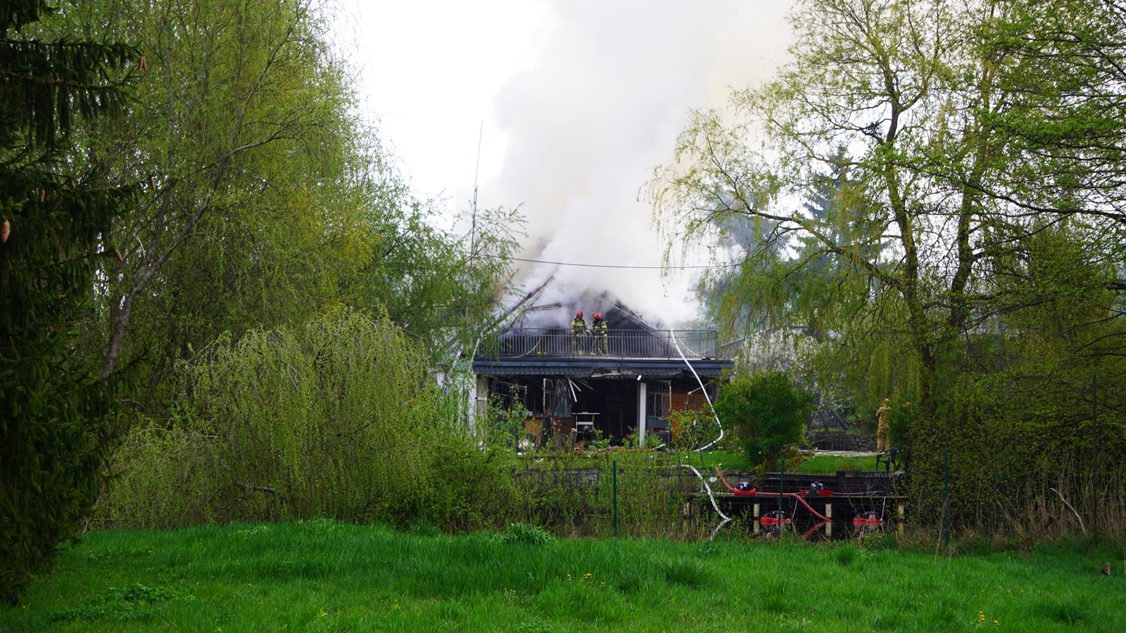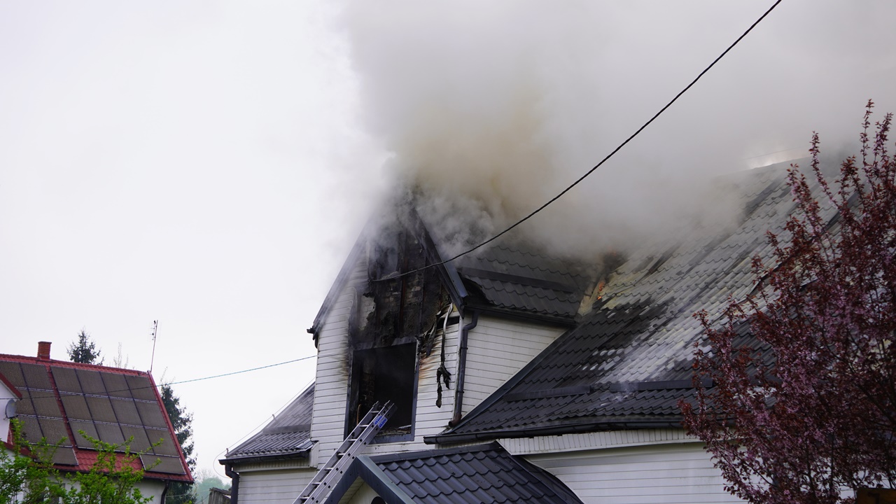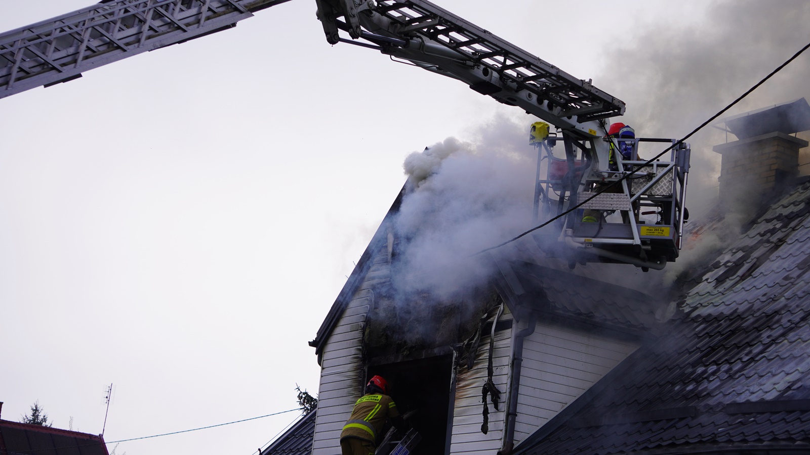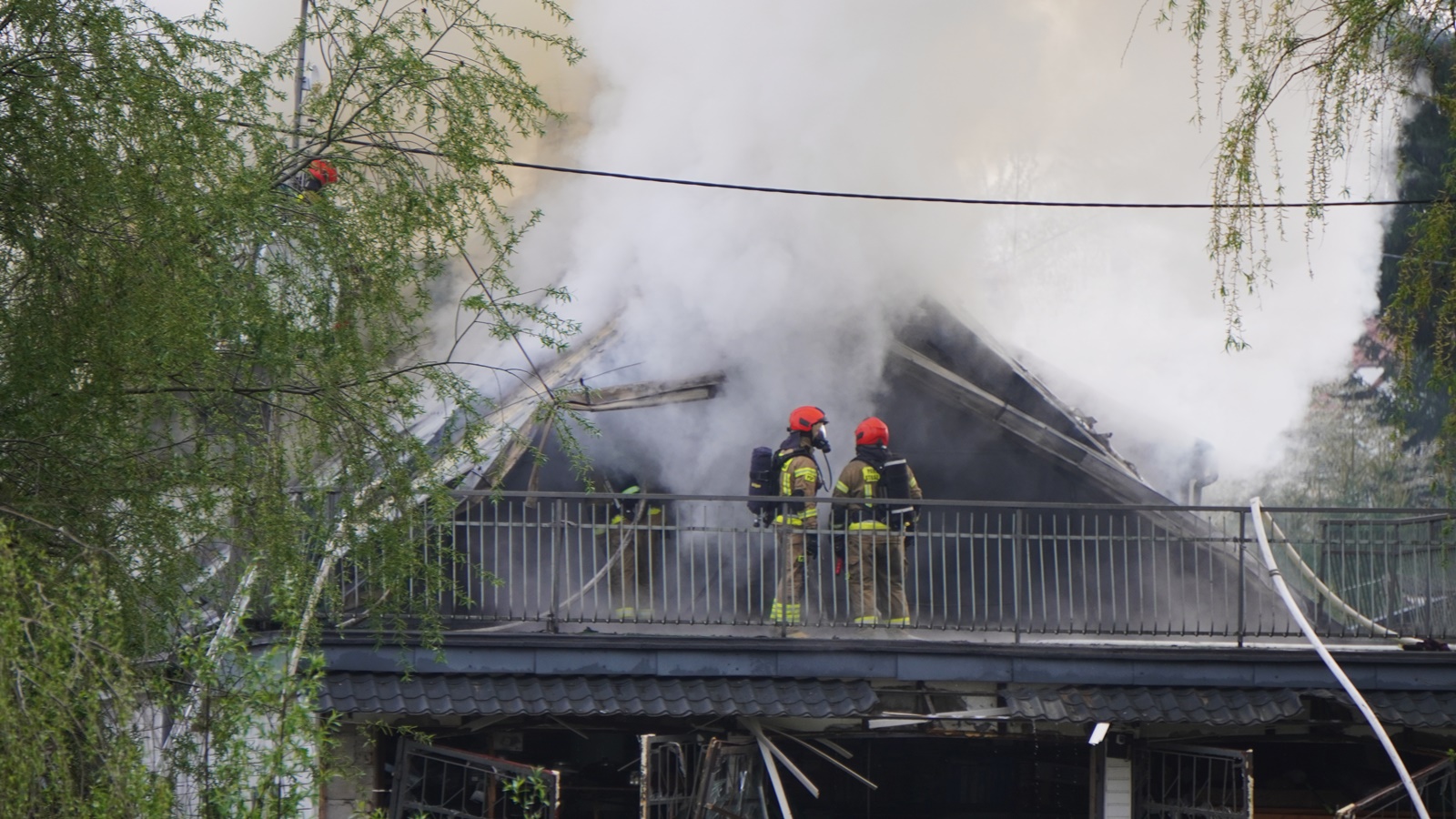 "Po przybyciu na miejsce zostano pożar w pełni rozwinięty na poddaszu budynku. Doszło tam do wybuchu niewiadomego pochodzenia. Ratownicy podczas działań znaleźli w budynku dwie butle gazowe, które zostały zabezpieczone i schłodzone w pobliskim stawie"