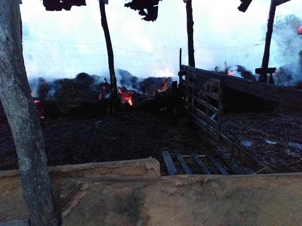 W pierwszej fazie działania strażacy podali 2 prądy wody na ognisko pożaru, broniąc jednocześnie pobliskiej wiaty obok, której znajdował się stos około 70 balotów siana.