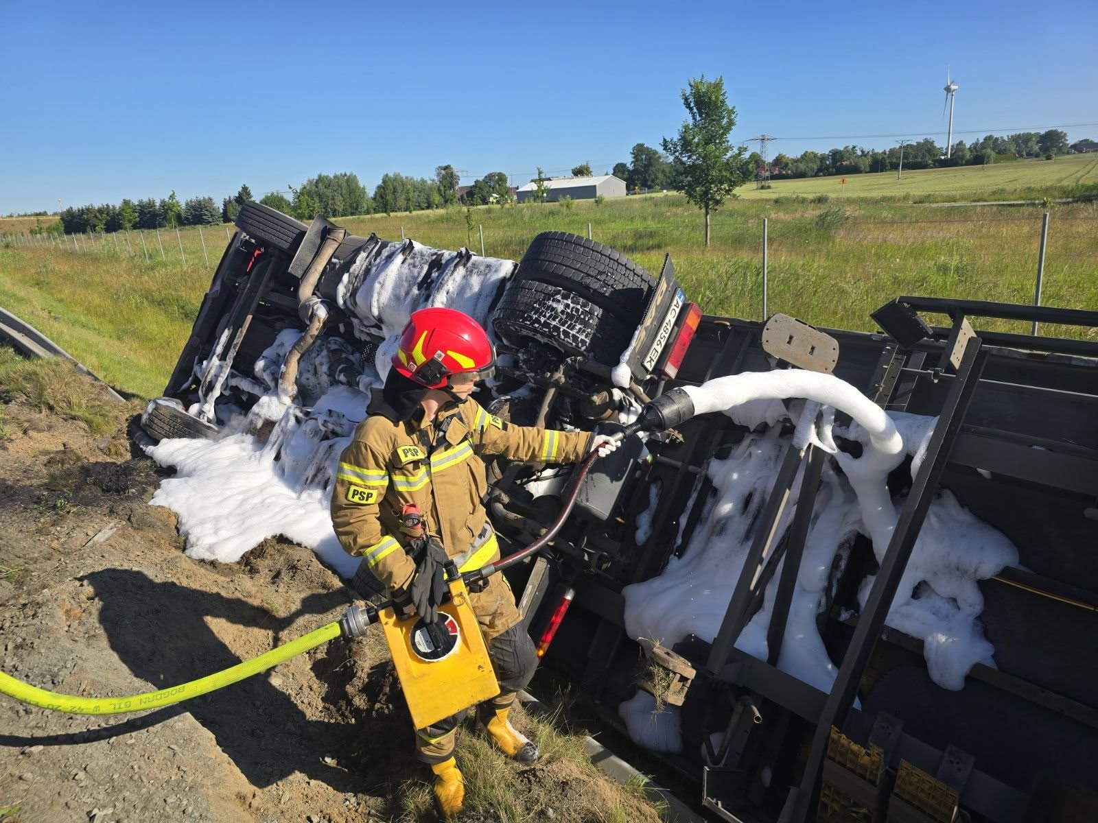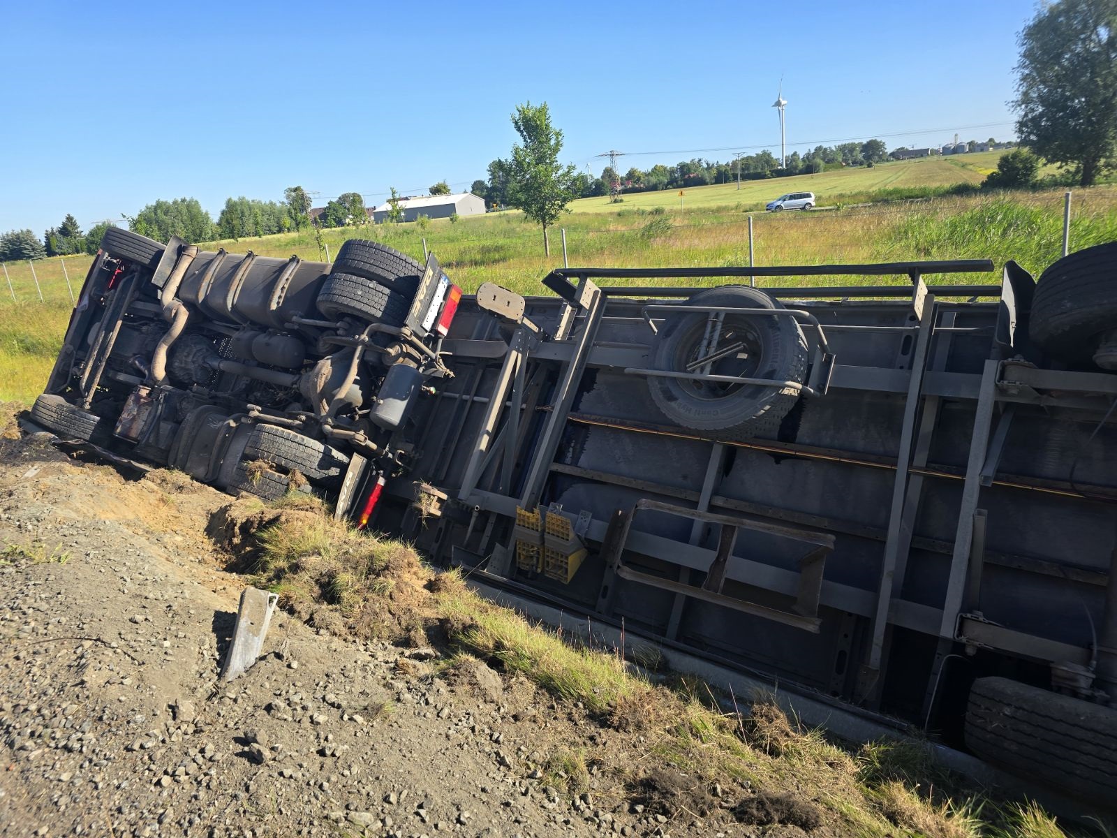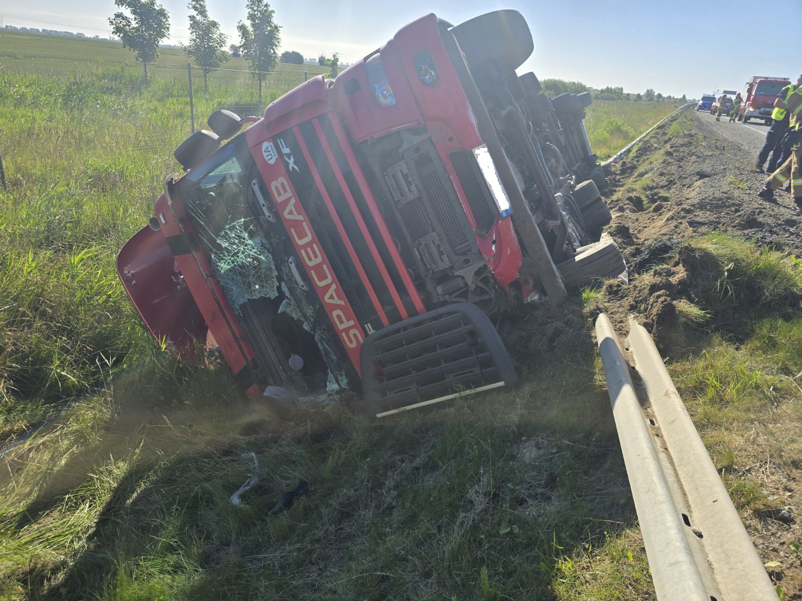 Kierowca pojazdu ciężarowego po przebadaniu przez ratowników medycznych pozostał na miejscu zdarzenia.