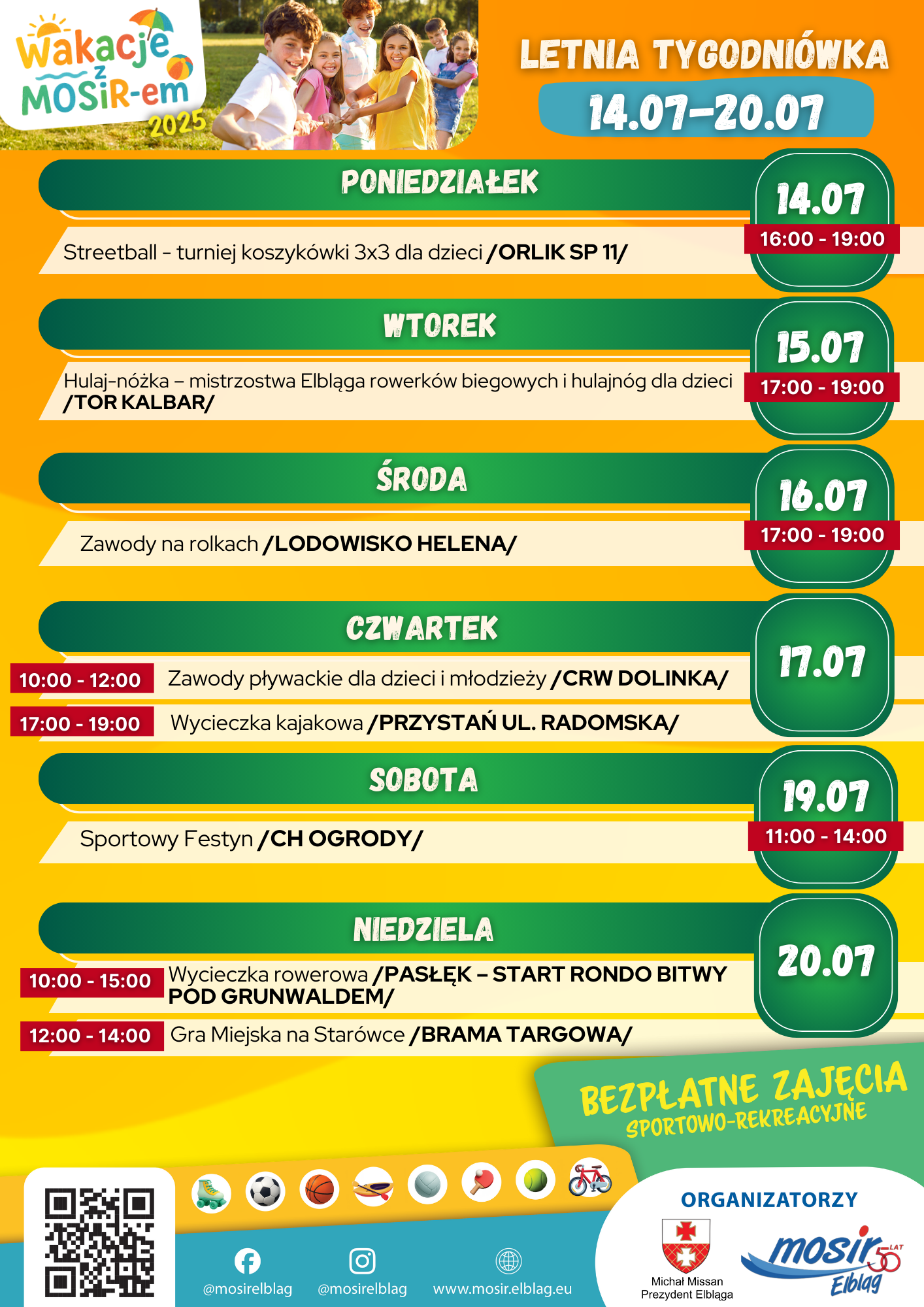 W czwartek zapraszamy dzieci i młodzież w wieku 6–15 lat do udziału w wakacyjnych zawodach pływackich na Dolince. Styl dowolny, bez pomiaru czasu – liczy się ruch i dobra zabawa! Na każdego uczestnika czeka medal, a po zakończeniu rywalizacji możliwość bezpłatnego korzystania ze strefy rekreacyjnej. Obowiązują wcześniejsze zapisy – limit wynosi 100 osób.