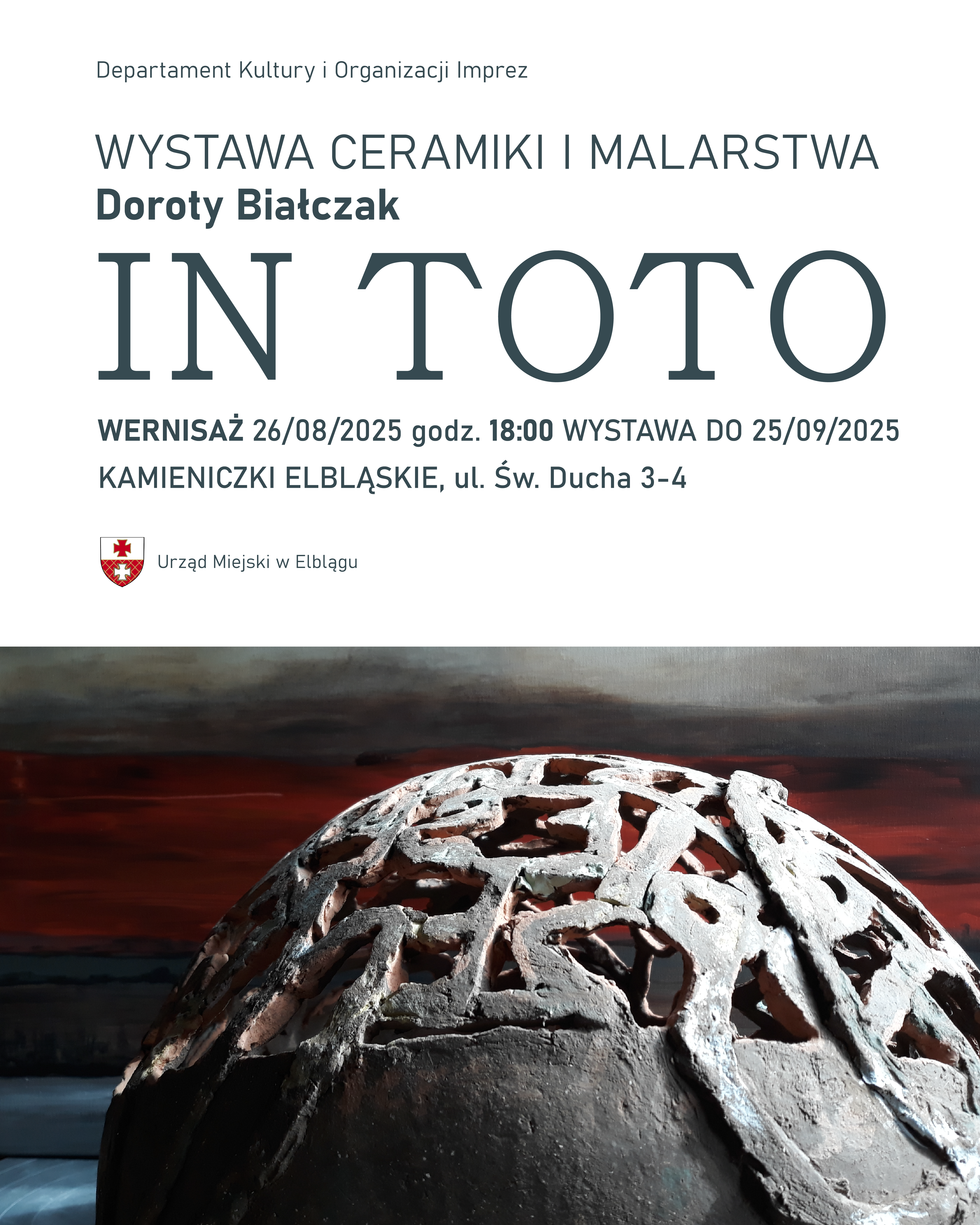 Wystawa IN TOTO to dialog dwóch światów: trójwymiarowej rzeźby ceramicznej i malarstwa, które operuje dwuwymiarową przestrzenią. Artystka z równą pasją posługuje się formą przestrzenną i kolorem, a każde medium niesie ze sobą inną jakość ekspresji.