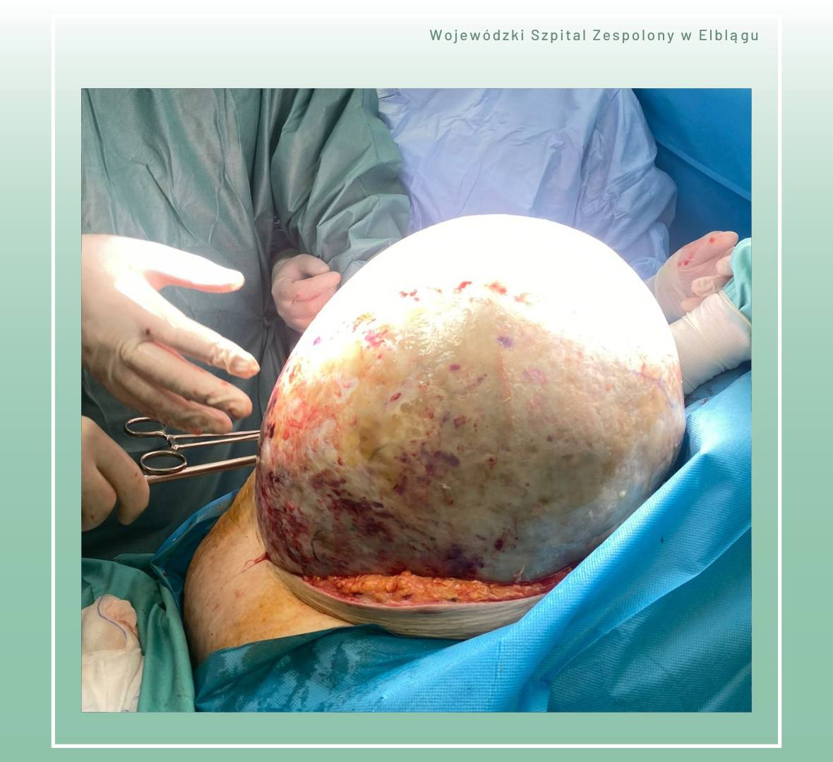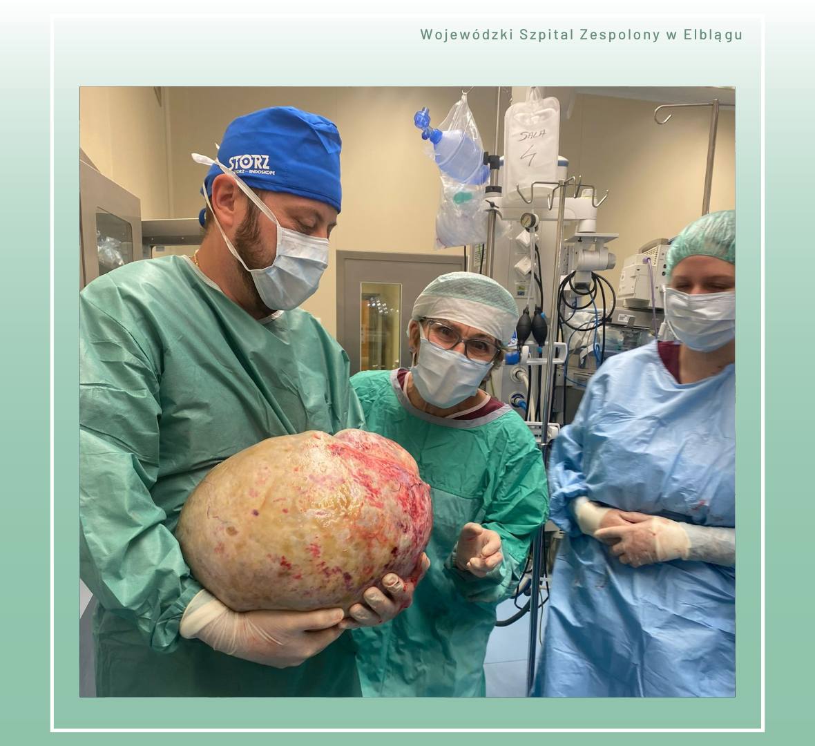 Do elbląskiego szpitala zgłosiła się 68-letnia pacjentka, u której od dwóch miesięcy narastały dolegliwości: wodobrzusze, duszność oraz bóle podbrzusza. Badania wykazały obecność wodobrzusza oraz ogromnego guza jajnika. Pacjentkę zakwalifikowano do operacji.