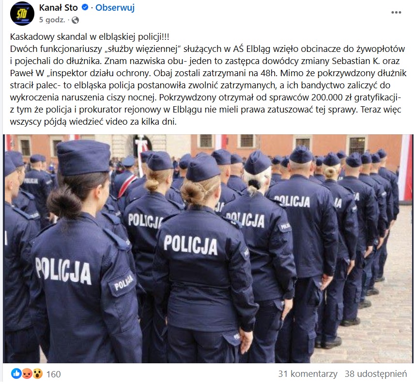 "Zamieszczanie w przestrzeni internetowej i medialnej niesprawdzonych, a co za tym idzie nieprawdziwych informacji na temat działań Policji, godzi w dobre imię tych, którzy poświęcają swoje życie, na rzecz służby innym. Takie właśnie informacje pojawiły się w Internecie w odniesieniu do okoliczności zatrzymania trzech mężczyzn w Elblągu, podejrzewanych o stosowanie przemocy w celu uzyskania zwrotu wierzytelności za wykonaną usługę. W tej sprawie trzej ustaleni podejrzani usłyszeli zarzuty z art. 191 § 2 kodeksu karnego, a do prokuratury trafił policyjny wniosek o zastosowanie środków zapobiegawczych wobec tych osób. Zebrany w sprawie materiał został przekazany do Prokuratury Rejonowej w Elblągu"