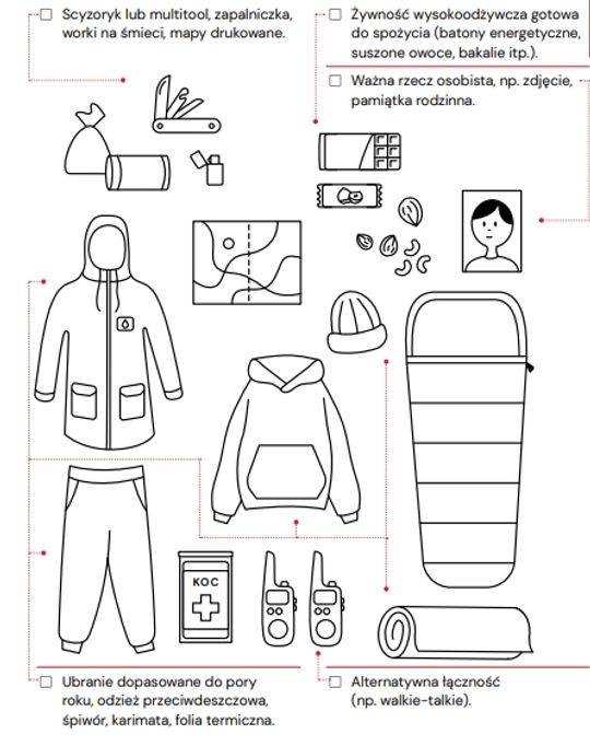 - Ubranie dopasowane do pory roku, odzież przeciwdeszczowa, śpiwór, karimata, folia termiczna.