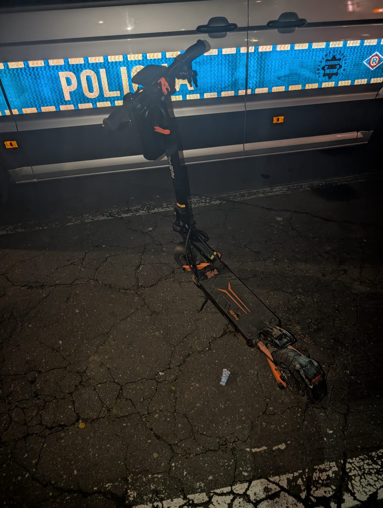 Policjanci zabezpieczyli hulajnogę, którą poruszał się 13-latek. Funkcjonariusze przypominają o dobrej praktyce używania kasków ochronnych jeżeli poruszamy się hulajnogą elektryczną lub rowerem.