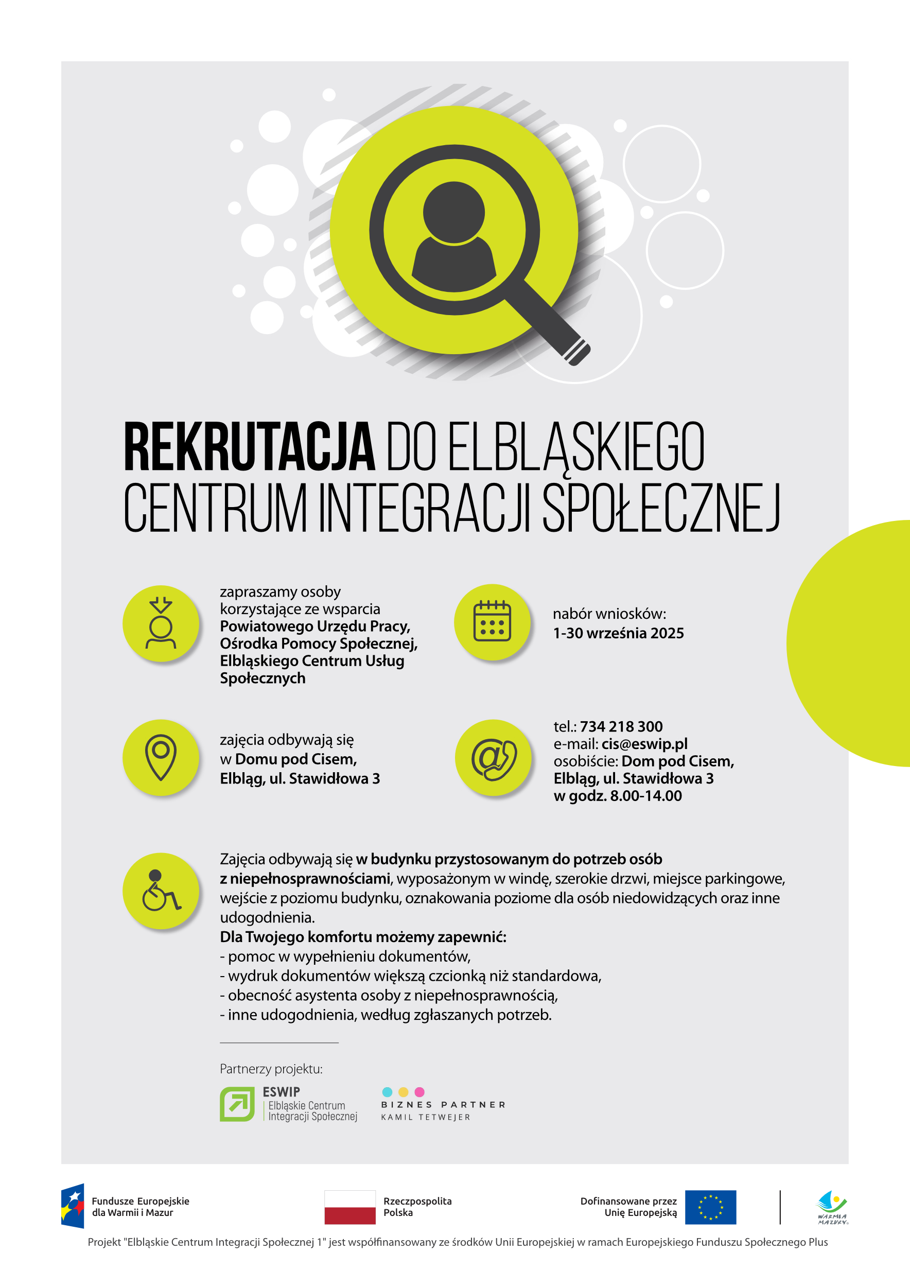 Projekt Elbląskie Centrum Integracji Społecznej 1 jest współfinansowany ze środków Unii Europejskiej w ramach Europejskiego Funduszu Społecznego Plus.