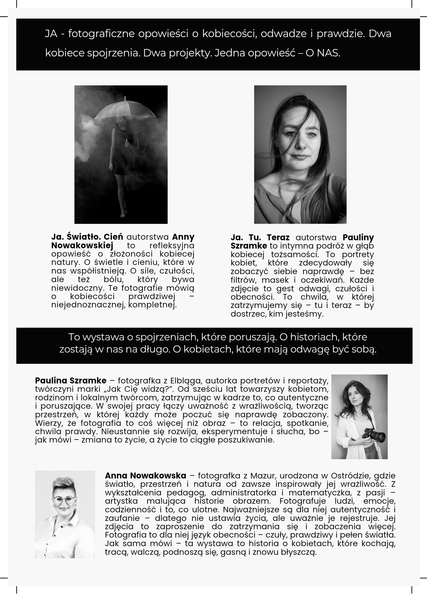 „JA. TU. TERAZ.” nie jest wystawą, którą ogląda się w biegu. To wydarzenie, które wymaga zatrzymania, wsłuchania się i – być może – odnalezienia własnej historii w twarzach innych kobiet. To zaproszenie do tego, by powiedzieć głośno: jestem wystarczająca, nawet jeśli moje życie jest czasem pełne cieni.