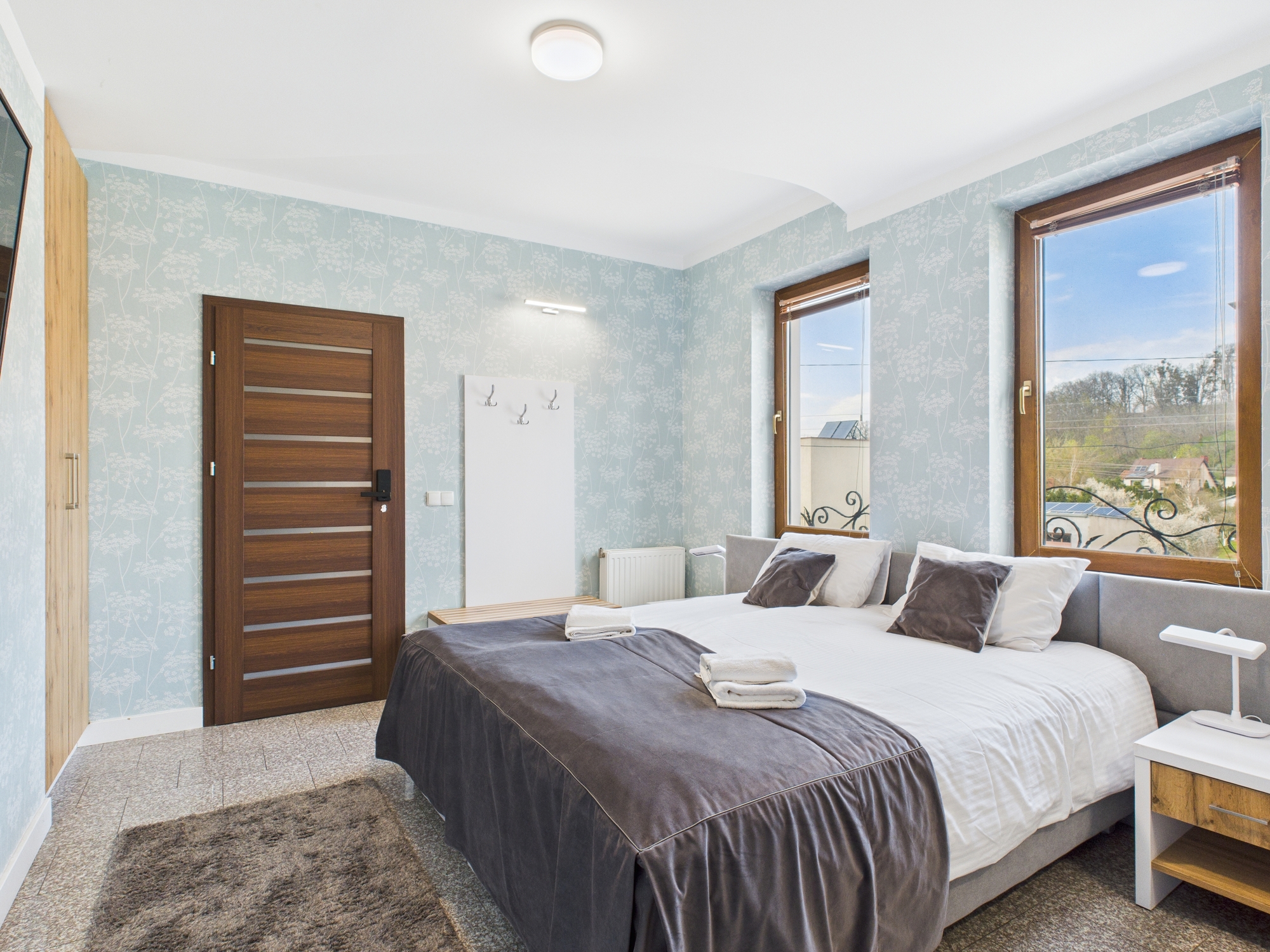 Na piętrze znajdują się trzy eleganckie apartamenty hotelowe. Każdy z nich ma własną łazienkę, oddzielne wejście i jest zarejestrowany na platformie Booking.com, gdzie cieszy się wysoką oceną – aż 8,2 punktu.