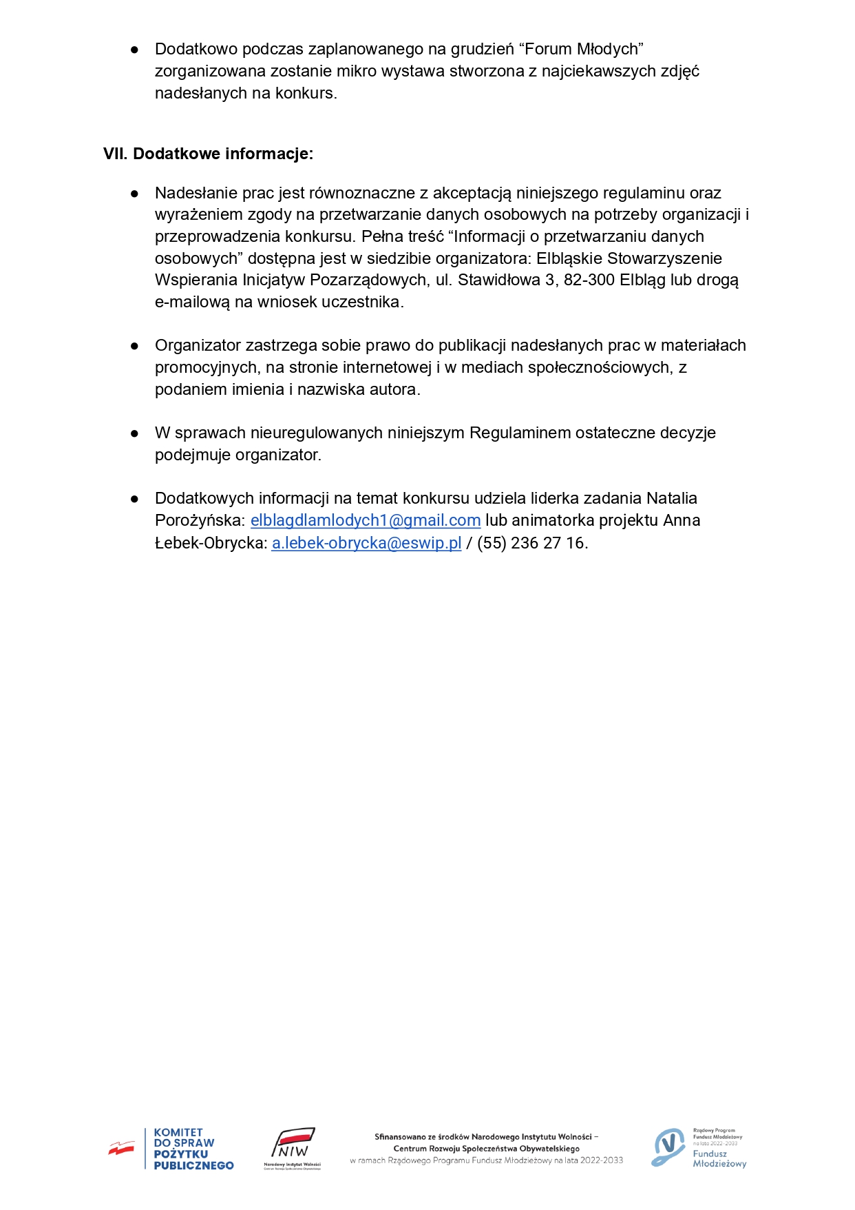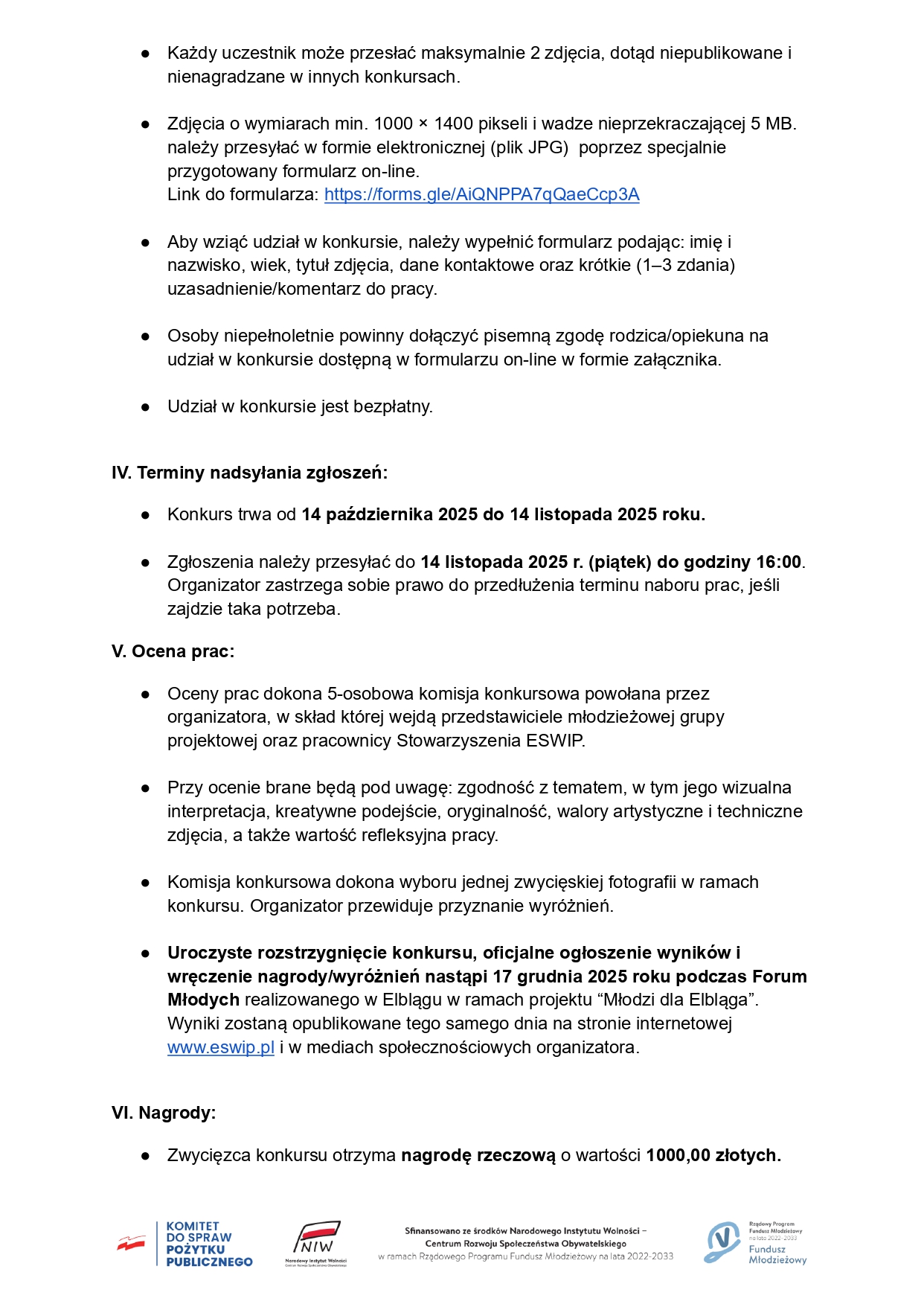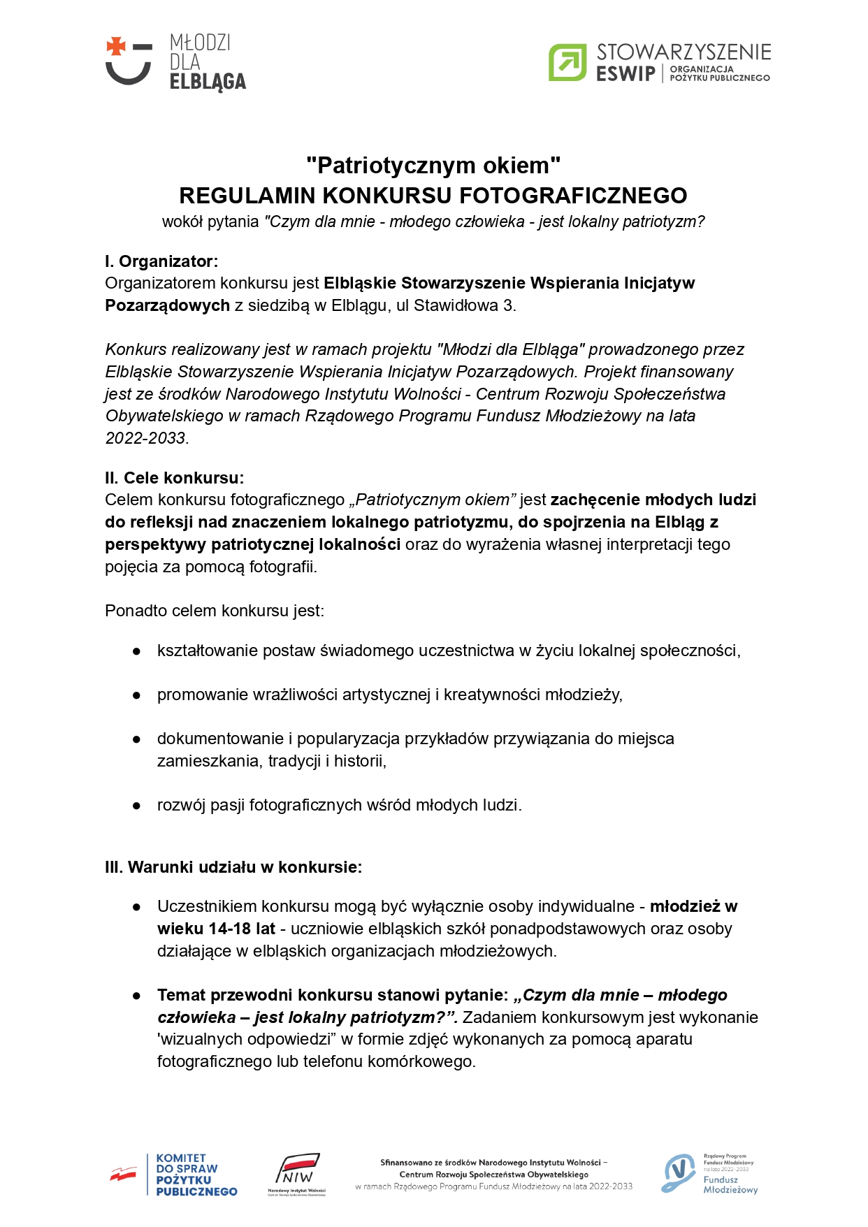 Konkurs organizowany jest w ramach projektu "Młodzi dla Elbląga" realizowanego przez Stowarzyszenie ESWIP i współfinansowanego ze środków Narodowego Instytutu Wolności - Centrum Rozwoju Społeczeństwa Obywatelskiego w ramach Rządowego Programu Fundusz Młodzieżowy na lata 2022-2033.