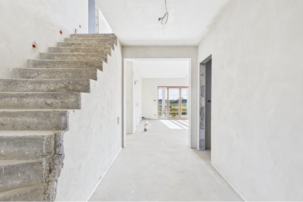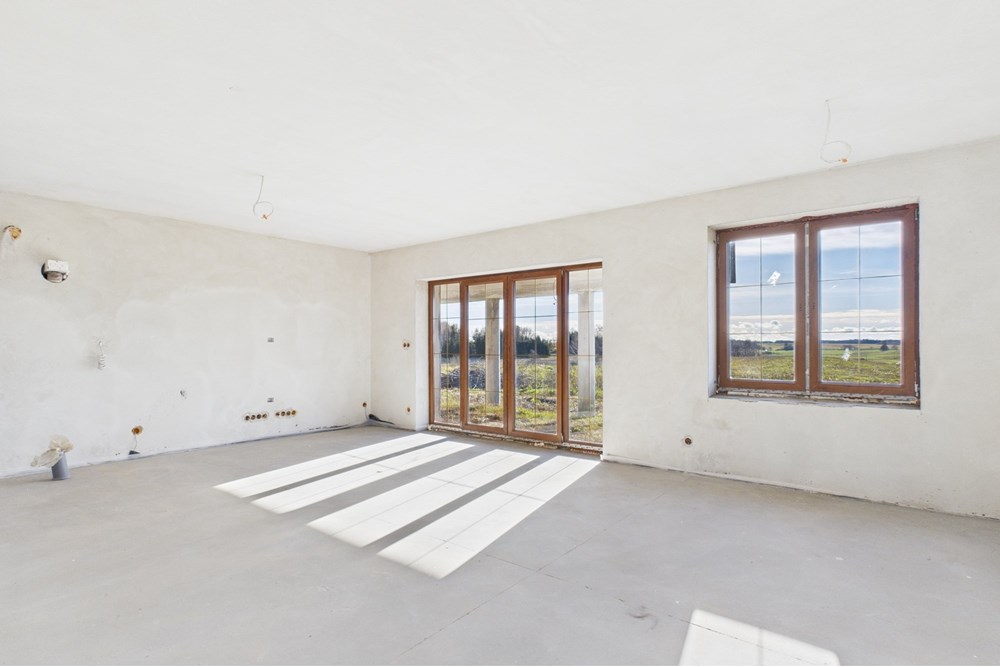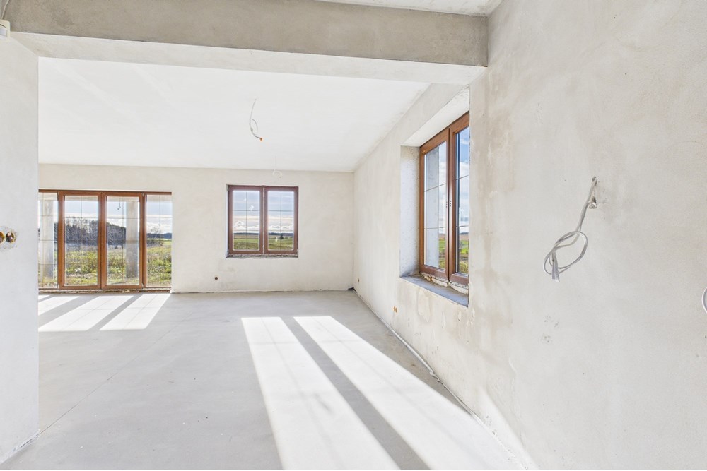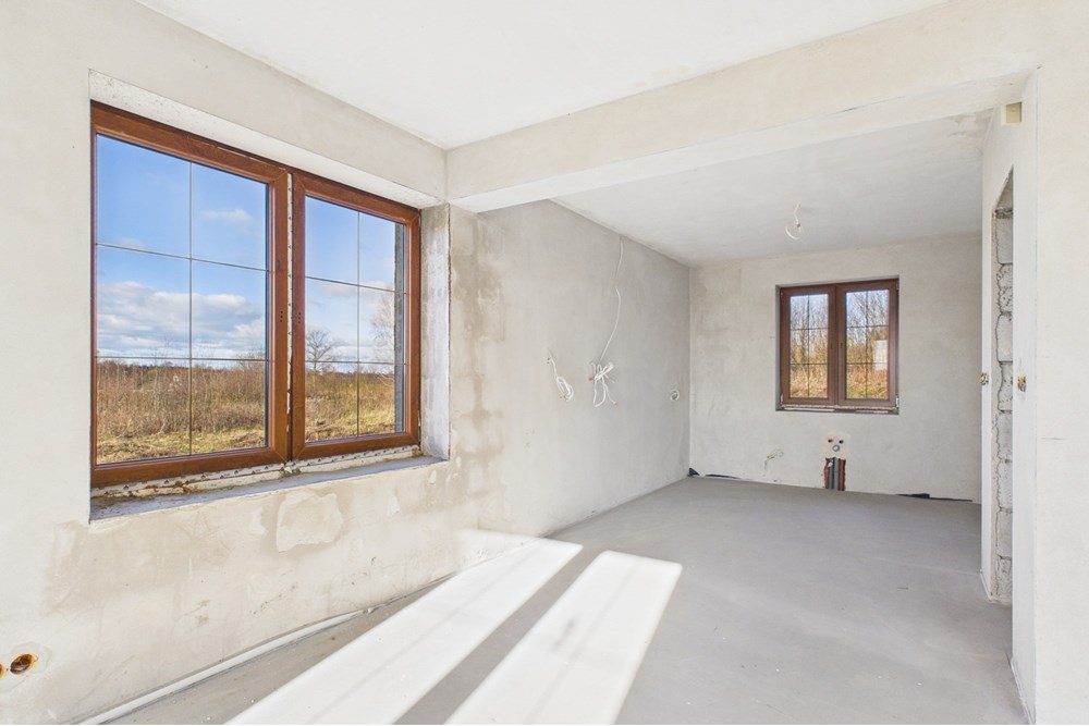 Budynek jest w stanie surowym zamkniętym, co daje pełną swobodę w wykończeniu wnętrz. Ogrzewanie podłogowe zostało już wykonane, a na działkę doprowadzono prąd i wodę. To solidna baza do dalszych prac.