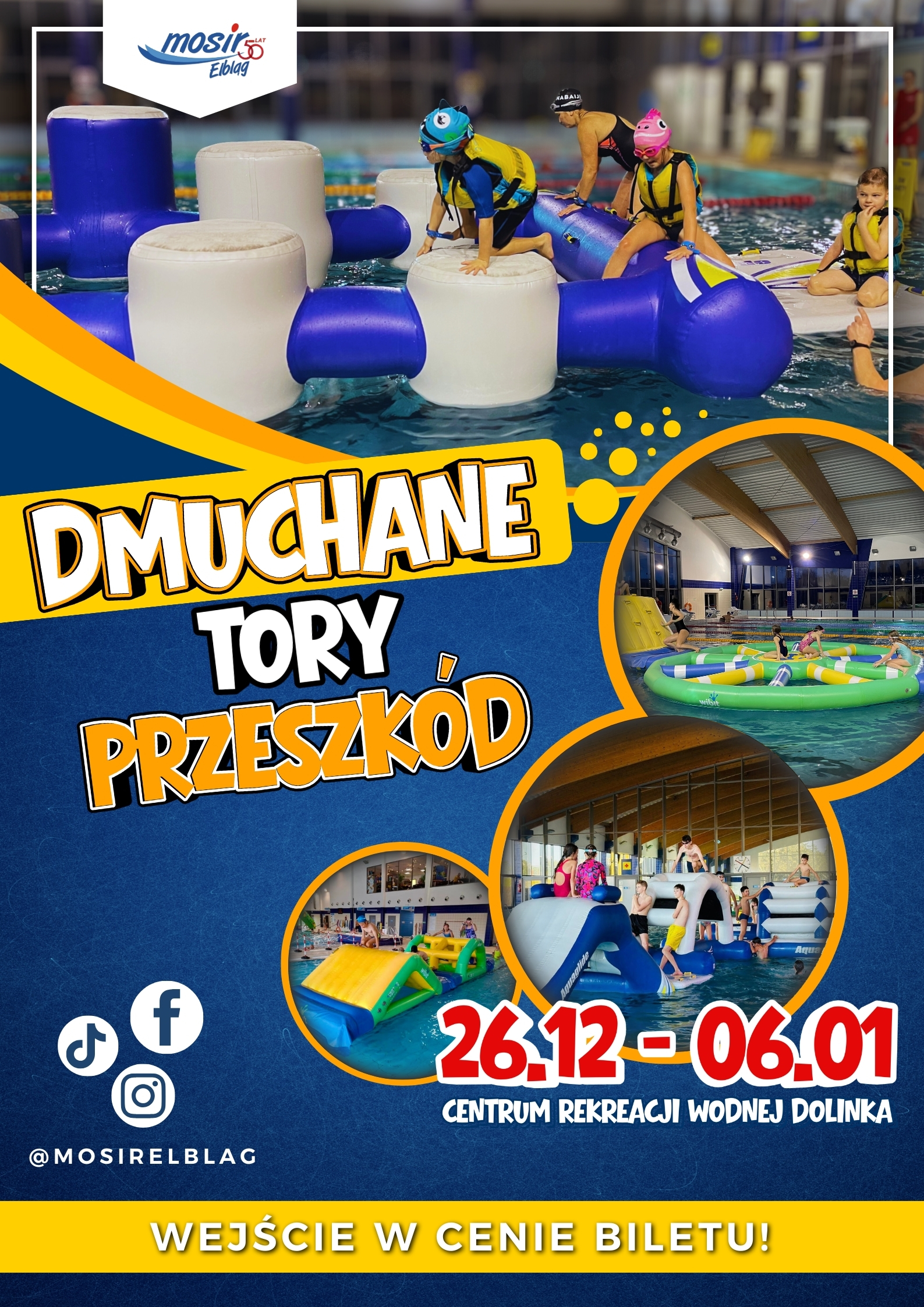 Z atrakcji będzie można korzystać od drugiego dnia świąt, 26 grudnia, od godziny 14:00 aż do wtorku, 6 stycznia, do godziny 22:00. Wstęp na dmuchane tory przeszkód zawarty jest w cenie standardowego biletu na basen. Cennik dostępny jest na stronie mosir.elblag.eu.