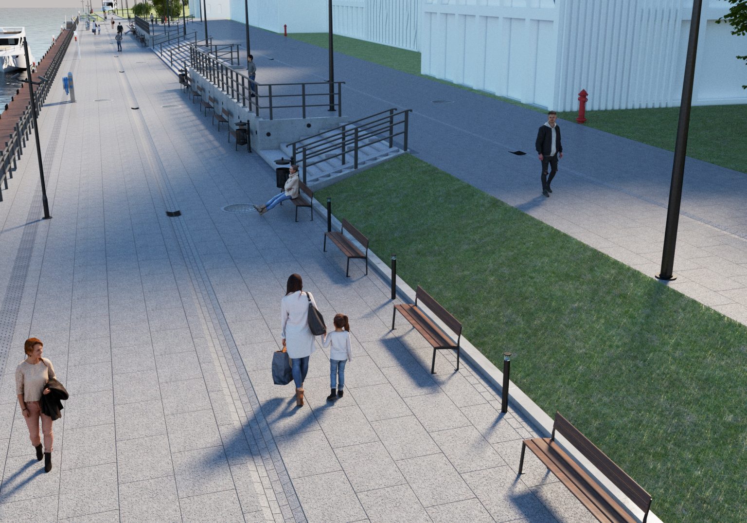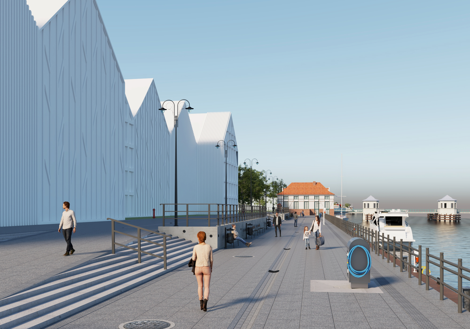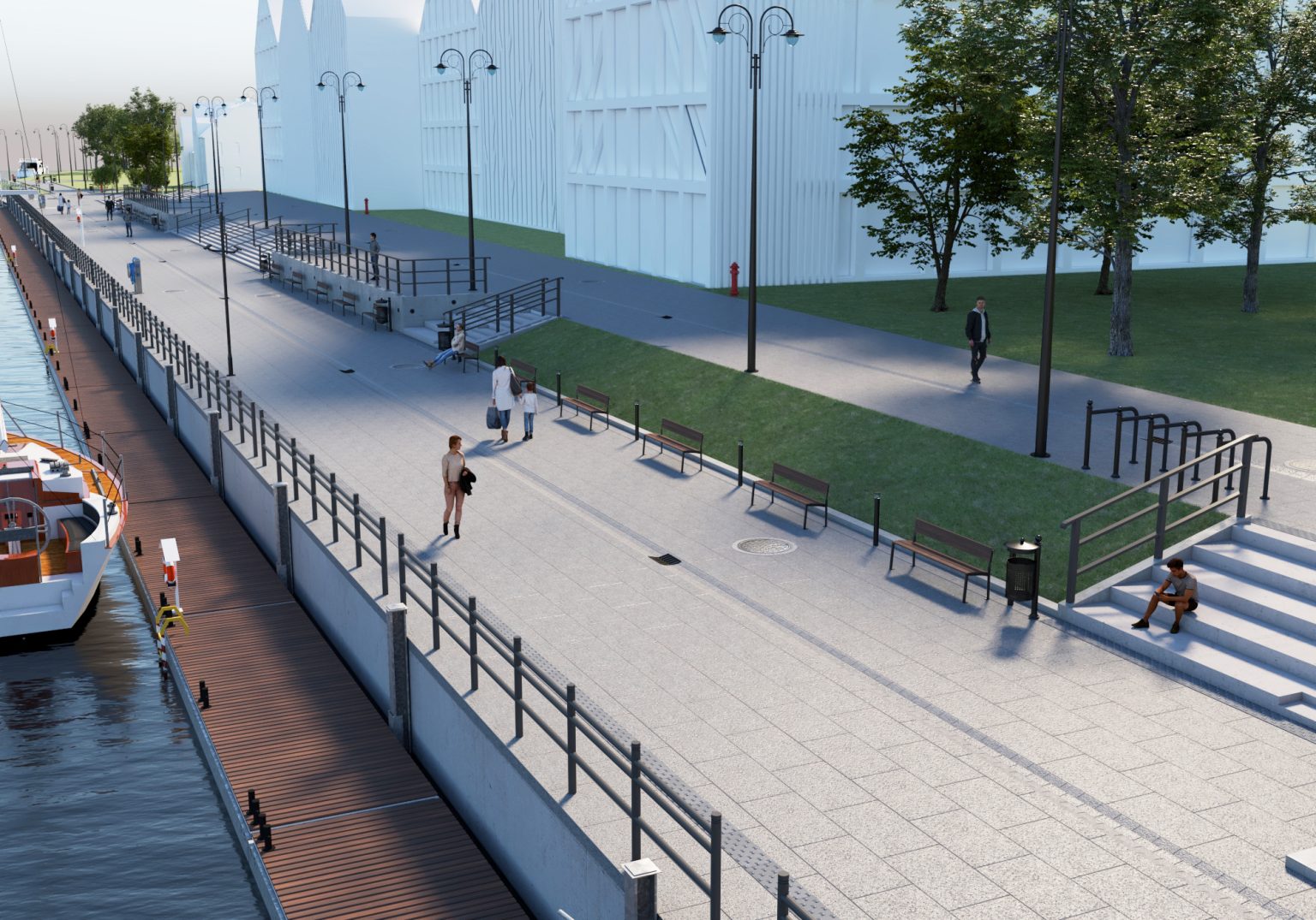 Wizualizacja nowoczesnego bulwaru z miejscami do cumowania łodzi.