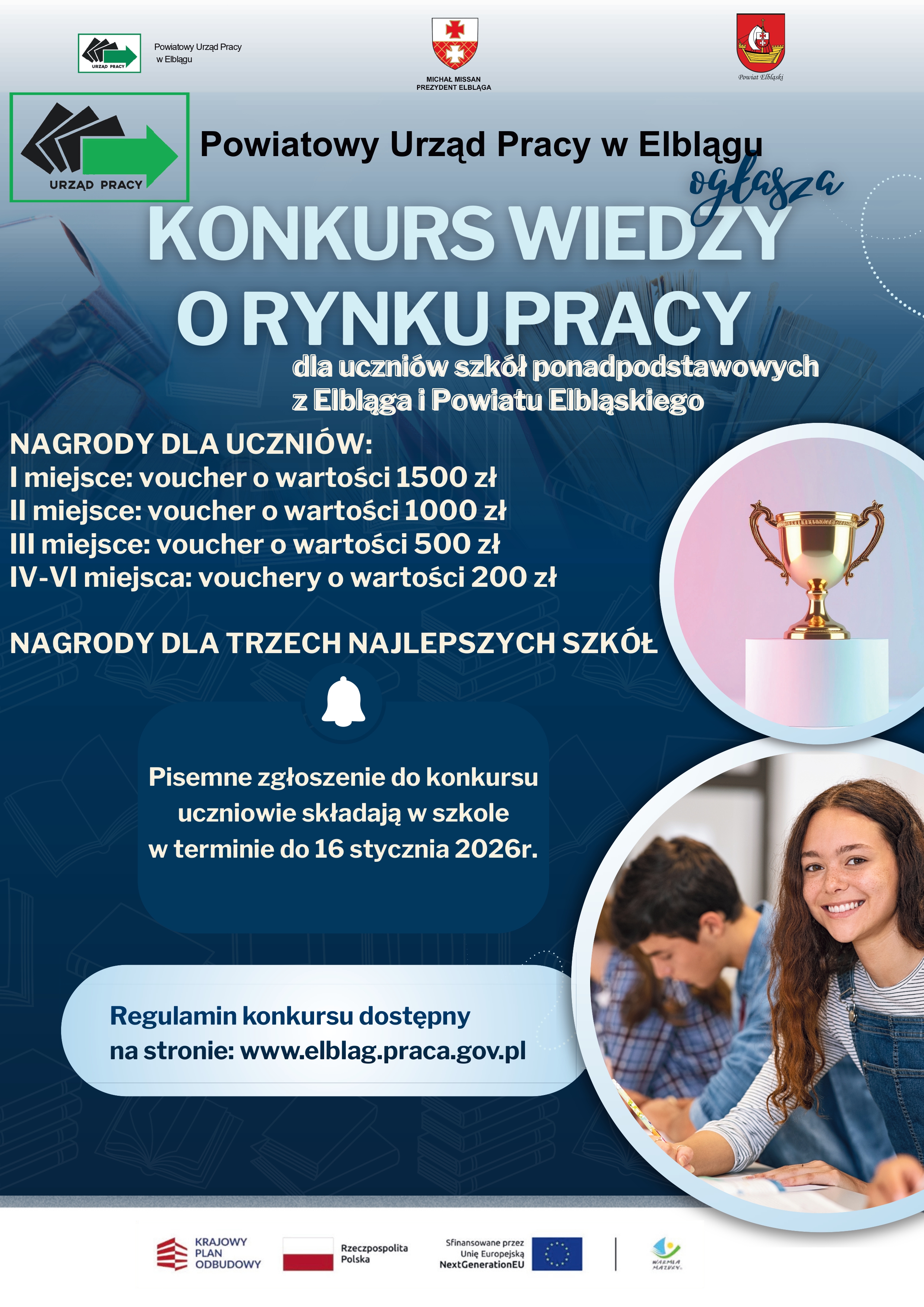 - Regulamin konkursu oraz zakres tematyczny są zamieszczone na stronie internetowej Powiatowego Urzędu Pracy w Elblągu (www.elblag.praca.gov.pl, Aktualności).