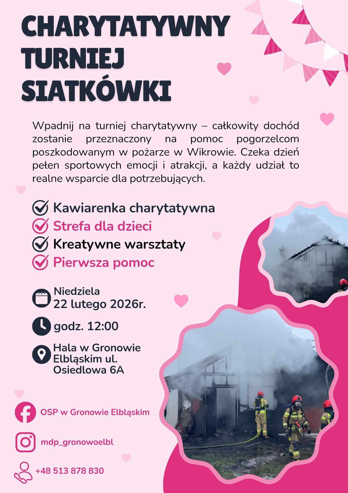 W niedzielę 22 lutego o godz. 12:00 w hali sportowej w Gronowie Elbląskim odbędzie się charytatywny turniej siatkówki, z którego cały dochód zostanie przeznaczony na wsparcie pogorzelców z Wikrowa. To nie będzie tylko sportowa rywalizacja. To będzie dzień wspólnoty i działania.