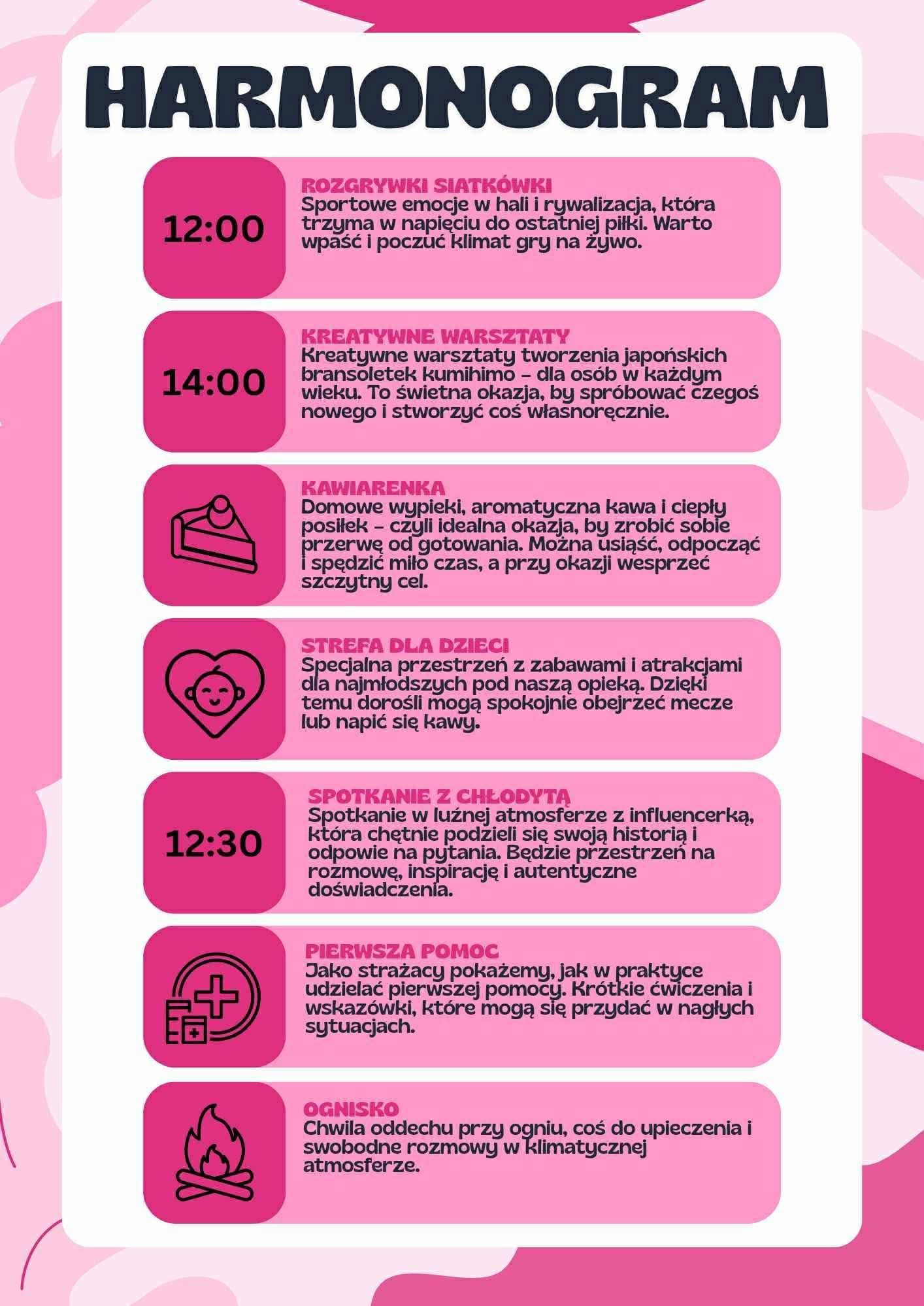 W programie znalazły się także pokazy pierwszej pomocy prowadzone przez strażaków. Krótkie ćwiczenia i praktyczne wskazówki pokażą, jak reagować w nagłych sytuacjach. To wiedza, która może uratować życie. Zaplanowano też spotkanie z gościem, które doda wydarzeniu osobistego wymiaru i przestrzeni do rozmowy. Na zakończenie przewidziano wspólne ognisko. Prosty moment bycia razem, który najlepiej oddaje sens tego dnia.